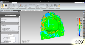 | Cálculo de la desviación de la malla fotogramétrica con respecto a la obtenida con el escáner láser. Como se puede ver, la mayoría del modelo presenta una desviación menor a 1 cm, lo que demuestra las posibilidades de la fotogrametría digital. |