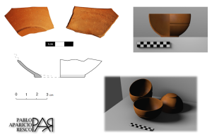 | Fragmento original, dibujo arqueológico y reconstrucción 3D de un cuenco Mayet XXXIII de paredes finas. |