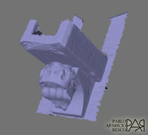 Posteriormente tuve que proceder al limpiado de la malla para eliminar aquellas partes que no me interesaran y que me fueran a entorpecer la unión de este modelo con el del edificio de las atarazanas. Después exporté en .obj el archivo para poder importarlo de forma eficaz a Blender (siempre acompañado de su textura en .mtl y .tif). Dentro de Blender completé mediante modelado manual aquellas partes que no había sido posible reconstruir mediante la fotogrametría, en especial la parte superior de la gárgola.