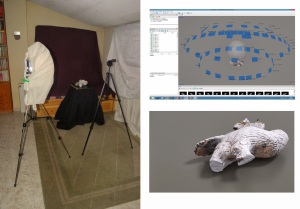 Izquierda: estudio casero de fotografía; Derecha, arriba: levantamiento fotogramétrico de una pieza; Derecha, abajo: renderizado de esa pieza.