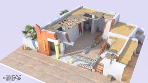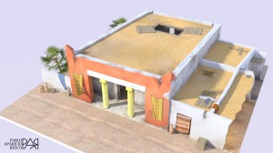 Sea como fuere, para llevar a cabo la reconstrucción virtual que he realizado con Blender me he basado entre otras cosas en esta segunda imagen, pues creo que es un acierto mostrar, por ejemplo, los materiales con los que está realizado el edificio (cubrición de madera y barro, zócalo de piedra y muros de adobe, etc.). He decidido reconstruir el templo en su entorno cercano ya que no se entiende si no su localización adosado a otras edificaciones más modestas y con la fachada abierta a la calle principal del emporio levantino.