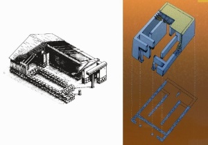 Como no puede ser de otro modo -si queremos hacer un trabajo realmente arqueológico- debemos comenzar por una exhaustiva documentación de la estructura o ambiente que queremos reconstruir: planimetrías, artículos, infografías ya existentes… todos estos datos deben ayudarnos a llevar a cabo una reconstrucción virtual lo más verídica posible. En este caso he realizado todo este proceso y me he topado al menos con dos reconstrucciones de cómo podría ser esta estructura, ambas muy diferentes entre sí.