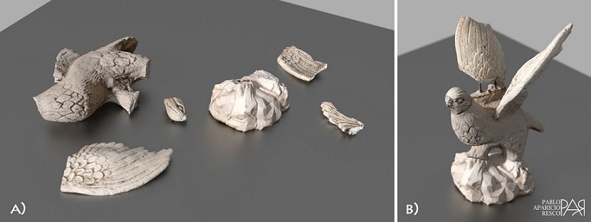 Hace un tiempo expliqué en qué consistía la anastilosis virtual, recordemos que se trata de la documentación geométrica en 3D de fragmentos de una pieza para posteriormente, en un software específico, recomponer esa pieza uniendo los fragmentos como si de un puzzle se tratara. Así lo realicé en el caso del A) Fragmentos del águila de piedra preparados para su anastilosis. B) Pieza recompuesta tras la anastilosis virtual.