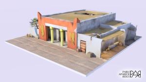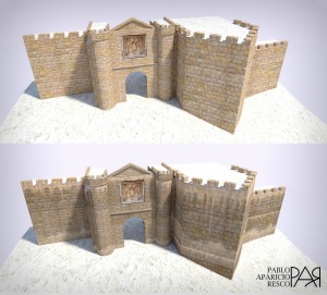 Con las reconstrucciones virtuales tenemos el problema de que su esbozo no es un puñado de líneas realizadas a mano alzada sino formas geométricas básicas (cubos, cilindros, esferas, etc.) por lo que naturalmente tienden a la línea recta y a una excesiva perfección que resulta poco realista. Es por ello por lo que debemos intentar caminar hacia la irregularidad en los renders de nuestras reconstrucciones finales: acompañarlas de elementos que impriman credibilidad pero que no distraigan de lo que verdaderamente importa (la forma del edificio, sus usos, etc.). Así intenté llevarlo a cabo en la reconstrucción virtual del