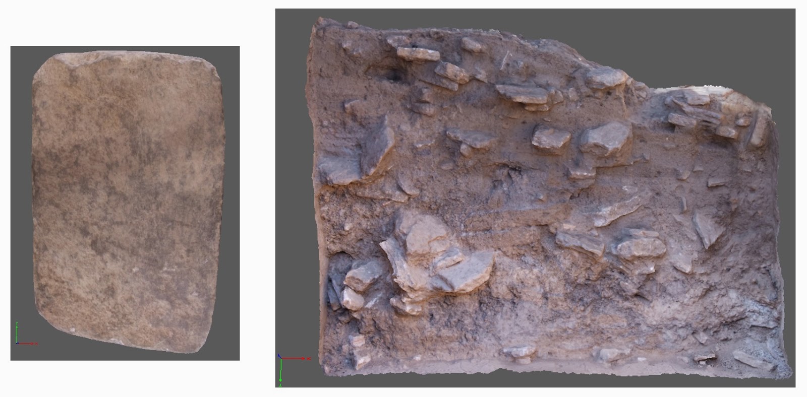 | Modelos fotogramétricos de un raspador o desfibrilador (izquierda) y de un perfil de un sondeo o pozo de excavación (derecha). |