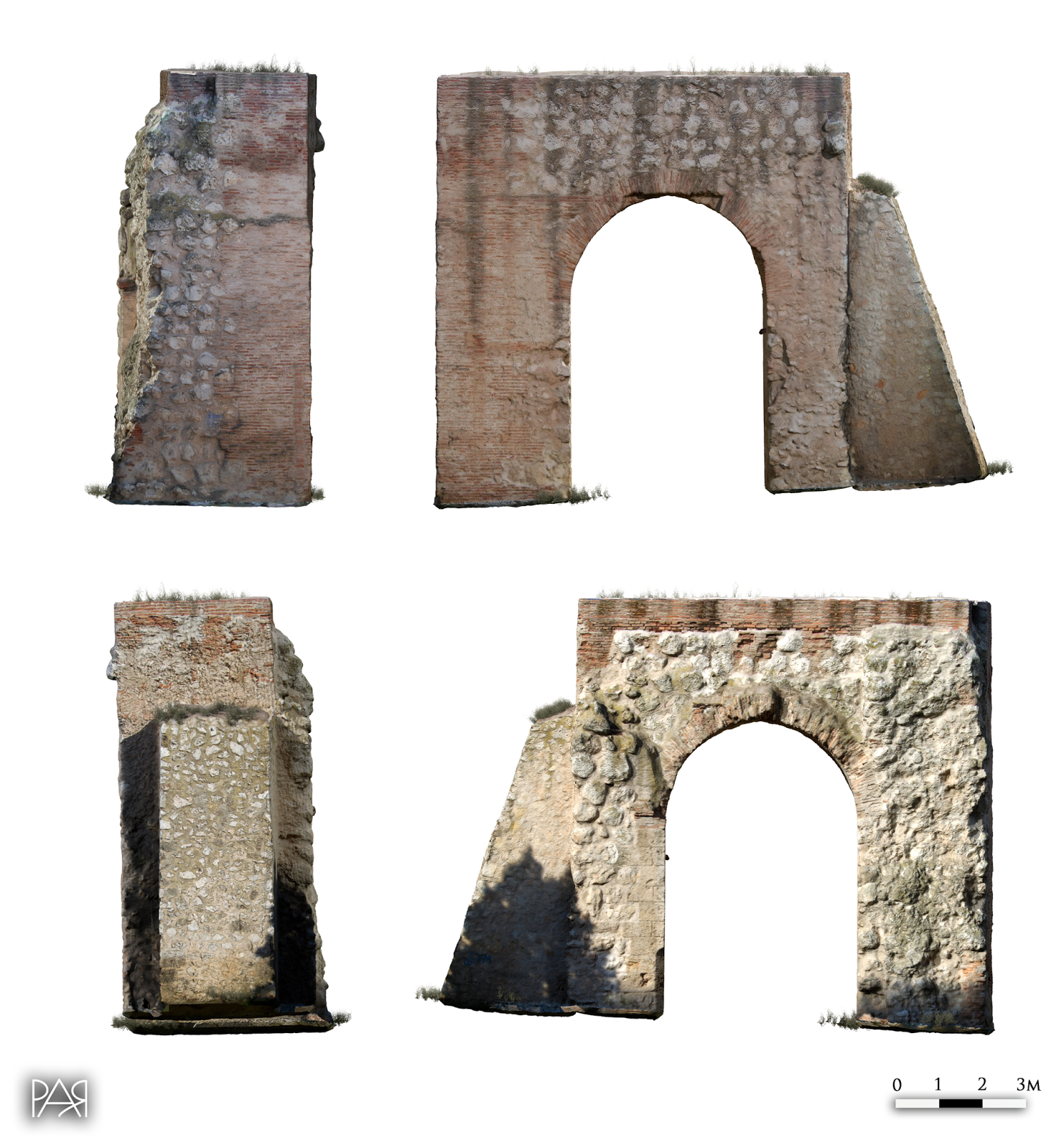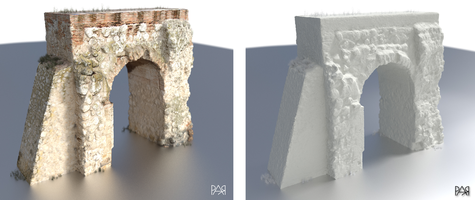 El modelo ha sido llevado a cabo a partir de 108 fotografías que tuvimos que tomar desde la parte baja, por lo que algunas zonas no se han recreado convenientemente debido a que no se pudieron tomar imágenes desde arriba. Además, las imágenes tuvieron que tomarse en un momento del día en el que el sol golpeaba con fuerza contra el arco por lo que eso ha creado ciertos problemas en las texturas. Aun así, los resultados son notablemente buenos.