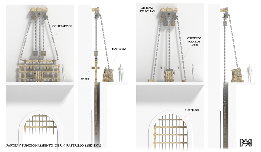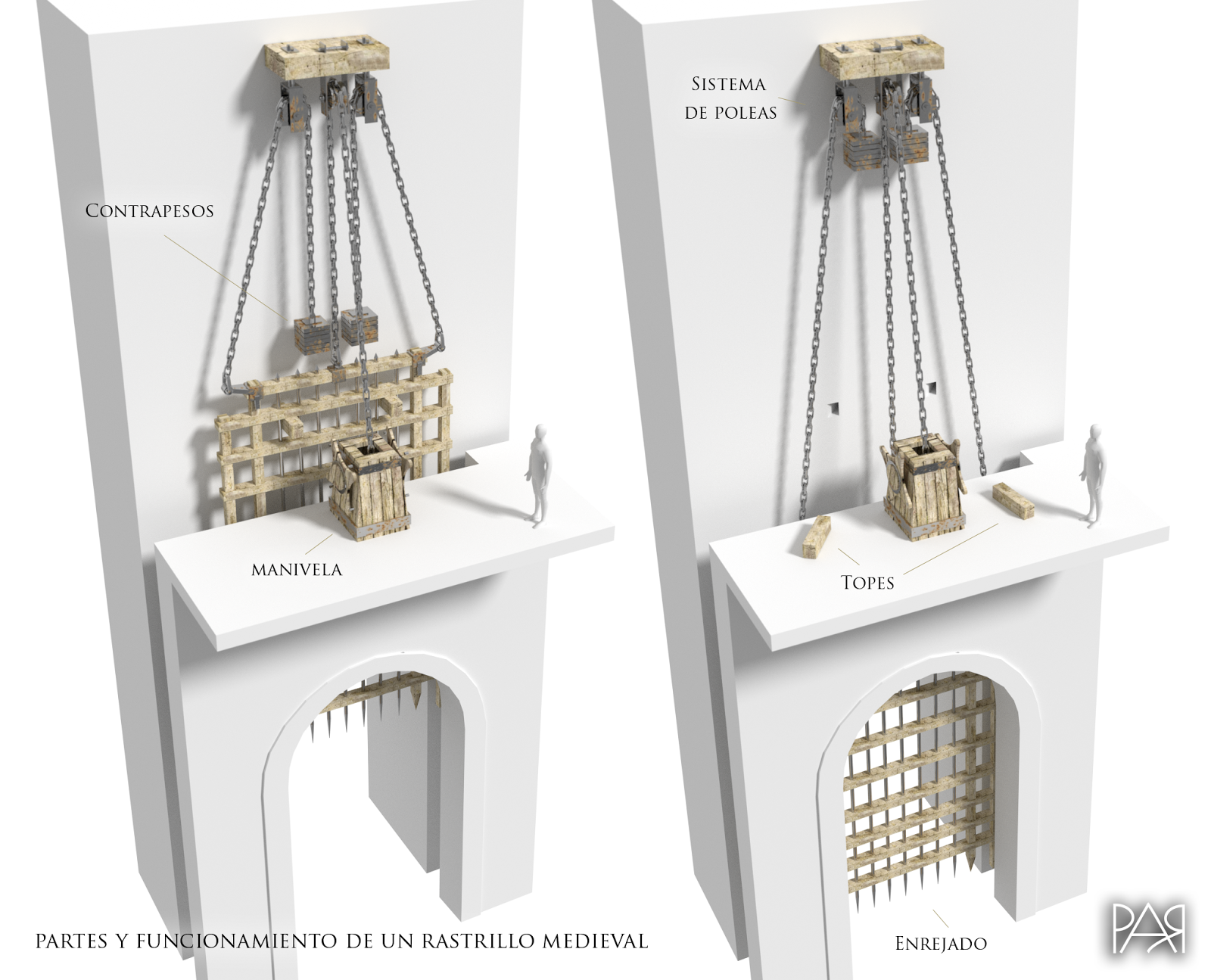 Los rastrillos eran unas unas fuertes rejas que impedían el paso a los enemigos mientras que permitían a los defensores defenderse lanzando flechas y otros proyectiles desde la parte superior y a través de la propia reja. El modo de funcionamiento era sencillo: la reja se encontraba sujeta con cadenas o fuertes sogas a una manivela y a unos contrapesos. Un sistema de poleas permitía bajar y subir la reja cuando fuera necesario. Mientras la reja se encontraba elevada, se sostenía -además de con los contrapesos, con unos fuertes topes que se insertaban en unos orificios hechos para este fin en el muro. Obviamente había muchos tipos de rastrillos, éste es uno de los más sencillos.