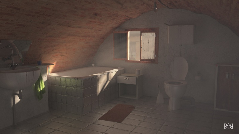Reconstrucción virtual de un baño de la segunda mitad del s. XX que se encontraba reutilizando el único arco conservado de la Puerta de Bejanque de la muralla de Guadalajara.