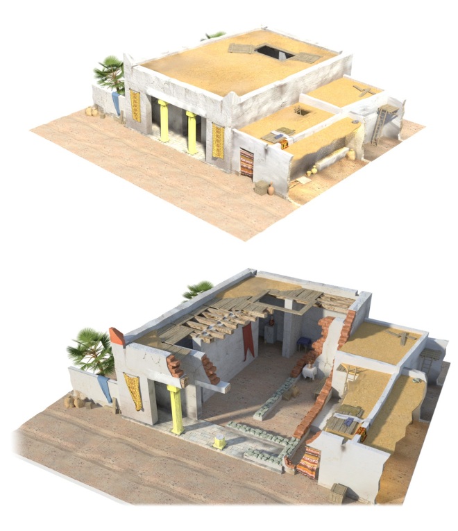 Hemos contado con la ayuda de algunos miembros del equipo investigador de la Illeta que que nos han aportado más datos sobre el edificio, permitiéndonos afinar la reconstrucción virtual. La fachada que Enrique Llobregat Conesa -quien excavó el pórtico- pensó que estaría pintada de rojo es el muro que separa el pórtico de las naves. Sin embargo, parece ser que se ha encontrado el estrato de color rojo cinabrio que Llobregat identificó como restos de pintura o del enlucido parietal coloreado por debajo del nivel de pavimentación del edificio formando una gruesa capa. Parece ser que es un tipo de arcilla empleada frecuentemente como impermeabilizante, por lo que se ha concluido que su uso es constructivo y no decorativo. Además, parece que sí se han encontrado restos de enlucido blanco en las fachadas exteriores. Esto condiciona fuertemente la reconstrucción virtual que planteamos del edificio. En cuanto a los muros del templo, quedaban restos de adobe in situ y sus medidas eran de 49 x 35 x 10 cm, por lo que ocupaban toda la anchura de los muros; nosotros los habíamos reconstruido más pequeños y esto es algo que hemos modificado en la reconstrucción actualizada. Parece, además, que en el interior del templo no aparecen apenas ánforas, por lo que también hemos decidido eliminarlas de la infografía, introduciendo, en cambio, pebeteros (piezas cerámicas en las que se quemaba incienso u otras hierbas aromáticas) que si han aparecido en las excavaciones en el interior del templo.