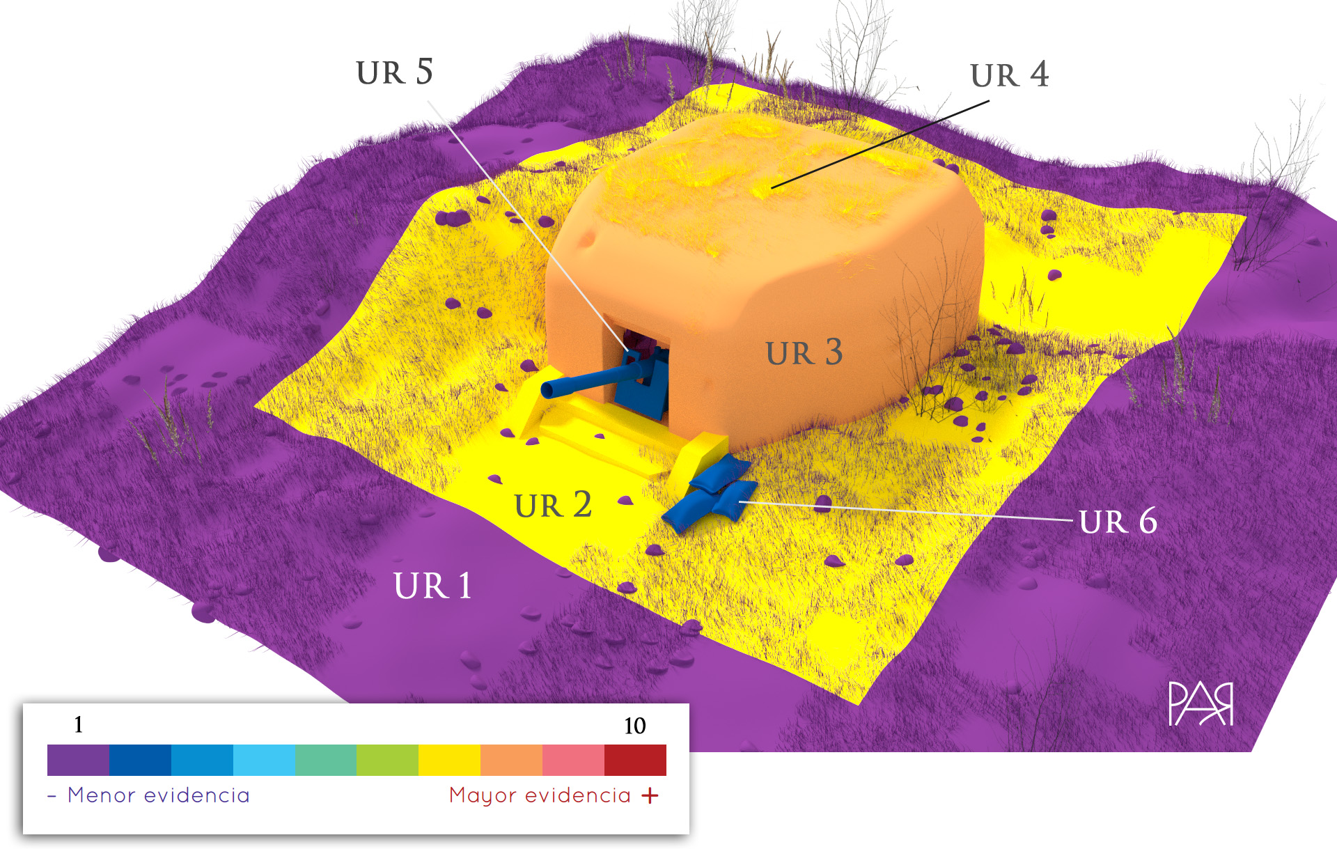 La autenticidad de la reconstrucción virtual propuesta se entiende gracias a la escala de evidencia histórico-arqueológica donde un tono más cálido implica un nivel de evidencia más fuerte mientras que unos tonos más fríos indican un nivel de evidencia menor. Esto se debe completar, además, con una ficha de cada una de las UR donde se justifique esta elección. Por el momento -y al no estar publicadas todavía las fichas- vamos a dejaros con una somera descripción de cada UR para que se comprenda el funcionamiento de esta herramienta: