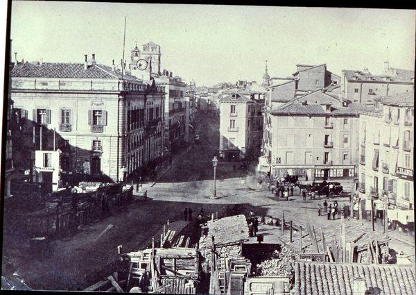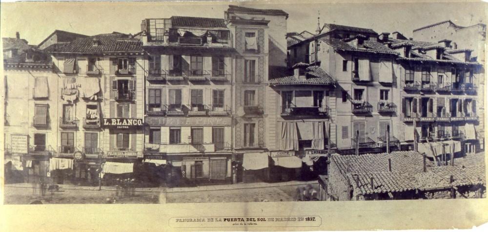 Sería interesante poder disfrutar la sensación de pasear de nuevo por esa antigua plaza, conocer sus comercios y edificios y comprender cómo fue, hace no mucho, la ciudad de Madrid. Uno de los edificios que fue destruido con la reforma es el de la Sastrería de L. Blanco, que se puede ver en esta fotografía de Charles Clifford tomada en 1857, cuando ya se habían comenzado a producir los derribos de los primeros edificios. Se trata de una vista de la entrada a la calle Alcalá (a la derecha):