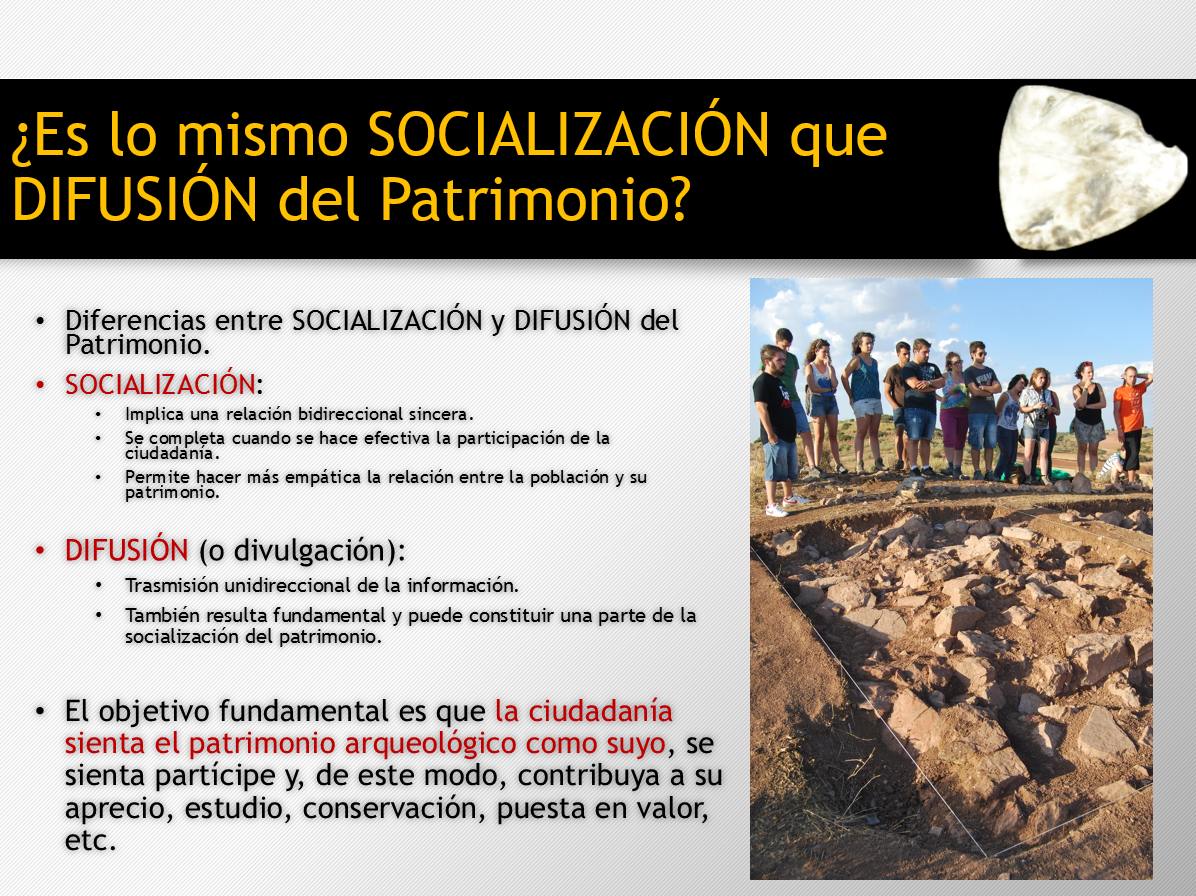 Resulta fundamental diferenciar entre socialización y difusión del patrimonio. Ambas son igualmente importantes y pueden formar parte del mismo proceso. La principal diferencia se halla en que la socialización implica una relación bidireccional entre arqueólogos profesionales y ciudadanía mientras que la difusión se entiende como una comunicación unidireccional, tal y como explicamos con esta diapositiva: