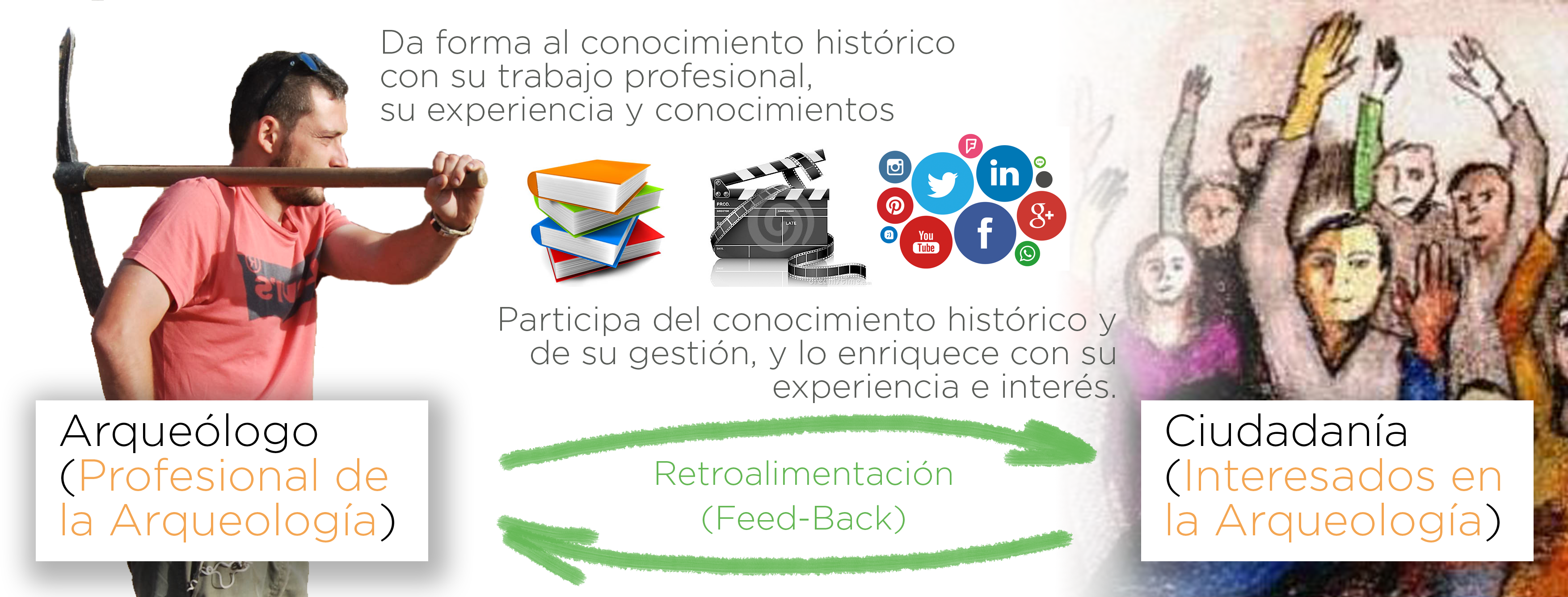 En la infografía que montamos para acompañar esta parte de la conferencia, se muestra esta relación: los arqueólogos son los profesionales que han sido formados para dar forma al conocimiento histórico, trabajo que se lleva a cabo mediante la excavación científica, el trabajo de laboratorio, las publicaciones, etc. Y junto a ellos se encuentra la ciudadanía (a distintos niveles: local, provincial, comarcal, regional, estatal, etc.) a la que se debe dar los medios para participar del conocimiento histórico, de la gestión de su patrimonio y de su enriquecimiento (entendido como enriquecimiento social, cultural, educativo, económico, etc., en la órbita de la muerte de la rentabilidad de la que hablaba en otro artículo).