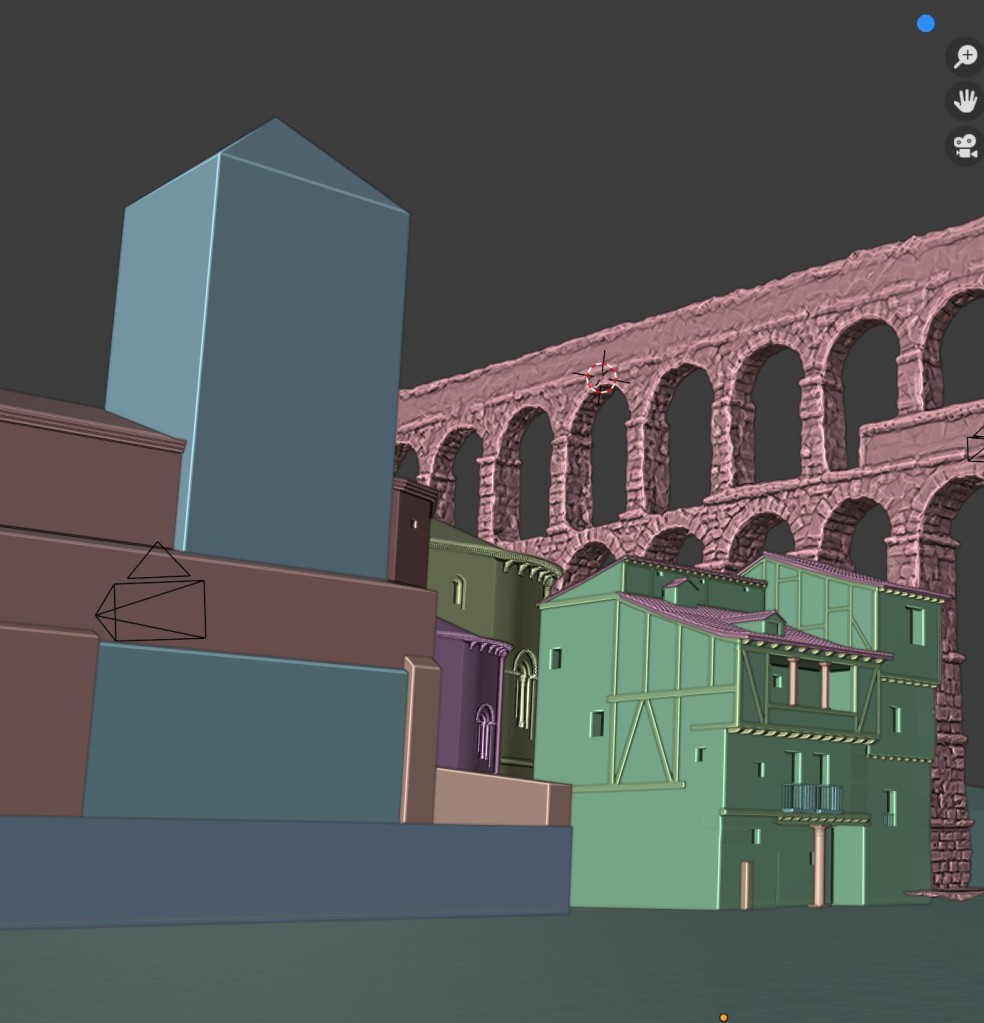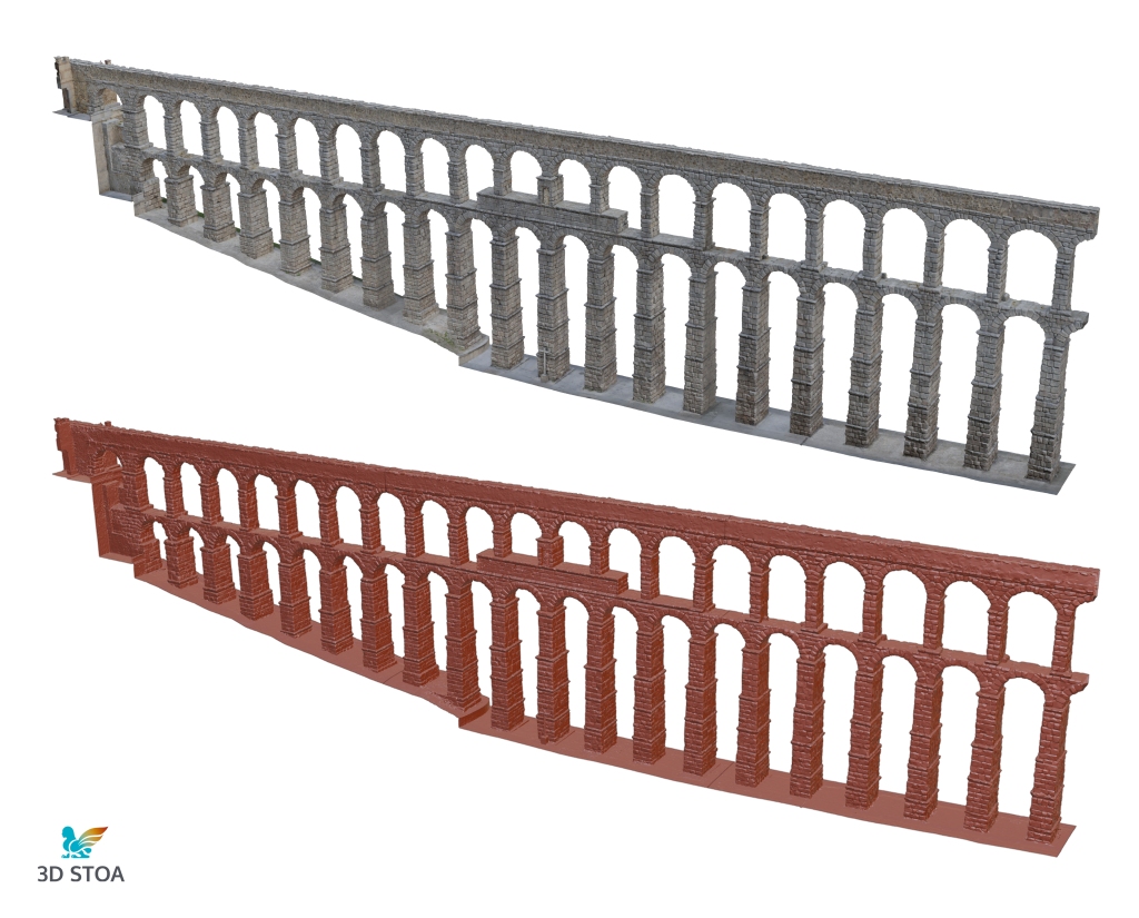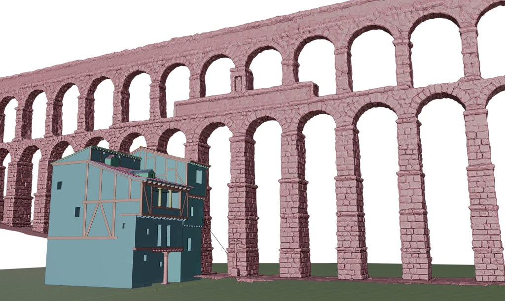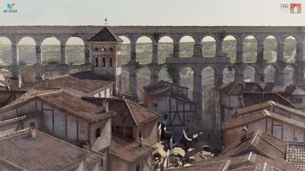 Posteriormente utilizamos como punto de referencia para comenzar la reconstrucción virtual el modelo 3D fotogramétrico del Acueducto de Segovia, documentado mediante el uso de escáner láser y fotogrametría por Miguel Fernández, de Virtua Nostrum, y Néstor F. Marqués. Este modelo de alto detalle, optimizado, nos aportó una base perfecta para levantar, en torno a él, la hipótesis de cómo pudo ser este espacio en el s. XVI.