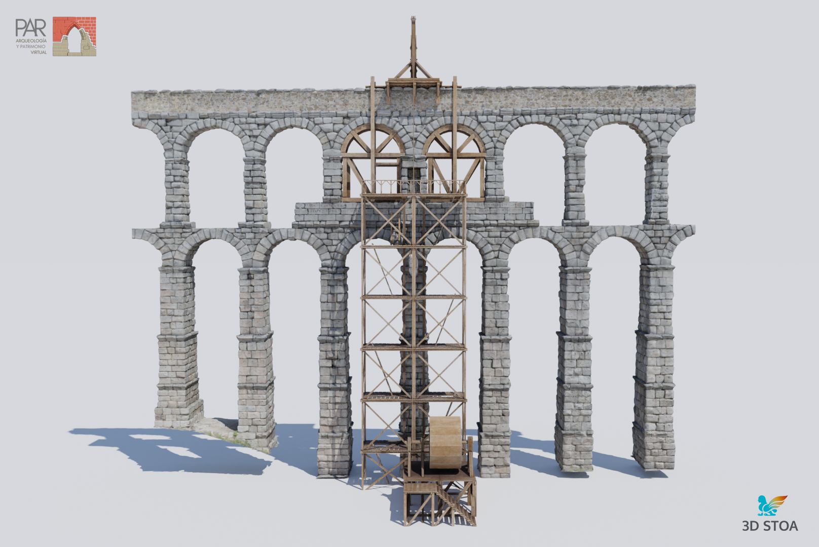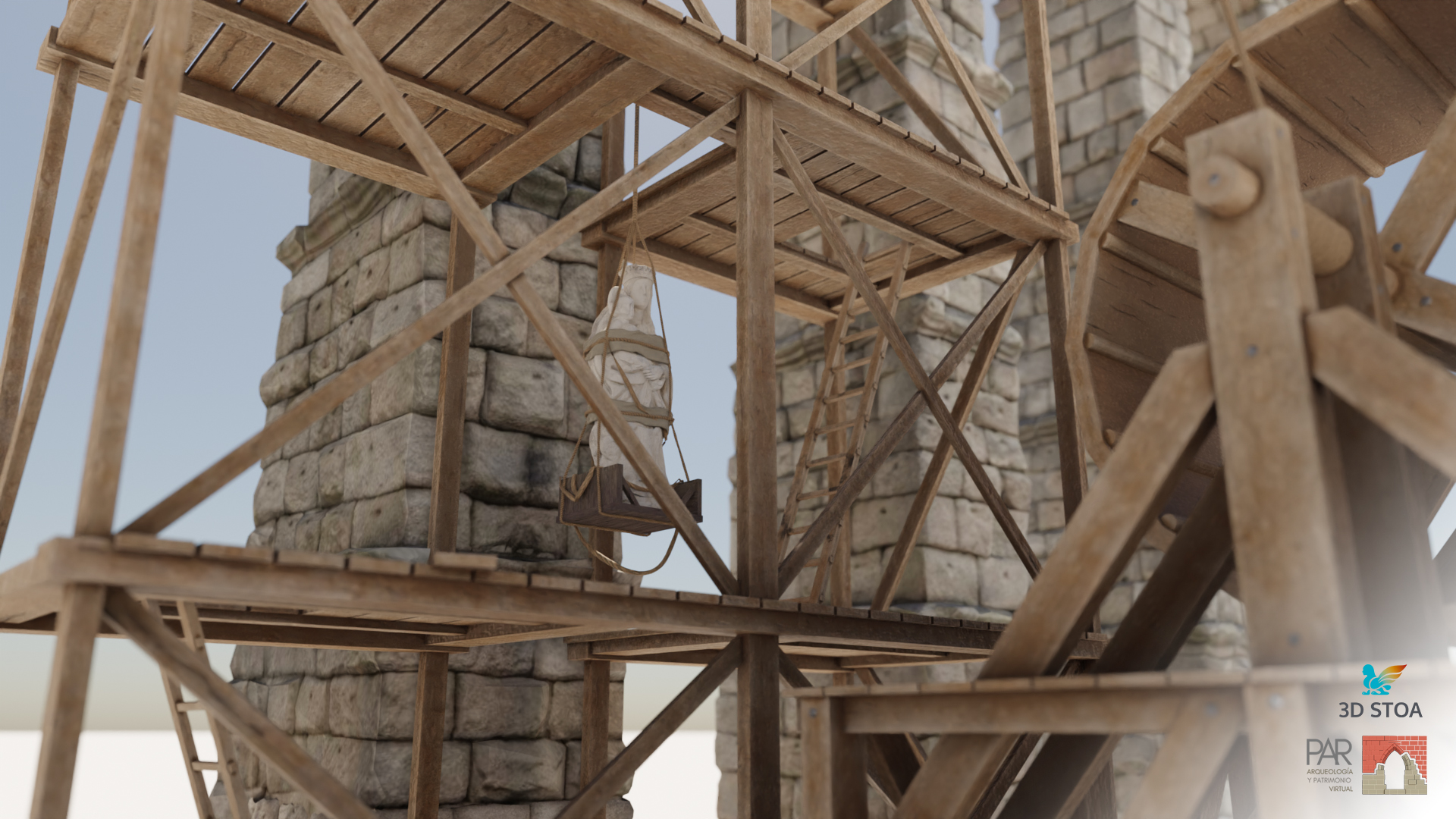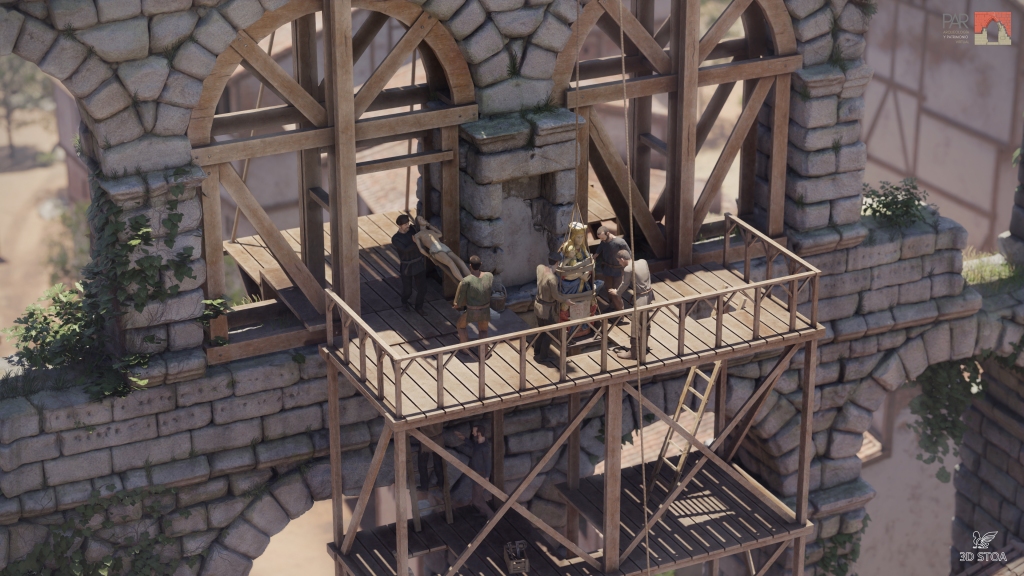 Posteriormente nos centramos en el añadido de detalles, siempre teniendo en cuenta los puntos de vista clave y el recorrido de la cámara en las animaciones que necesitábamos para el audiovisual. Organizar desde un principio los puntos de vista de los renderizados es fundamental para optimizar el trabajo a realizar. En este momento, además, fue muy importante definir la forma de los andamios y el funcionamiento de la grúa que levantaría las esculturas hasta la parte alta del Acueducto. Para ello seguimos varios tratados de la época entre los que destaca «Los veintiún libros de los ingenios y de las máquinas» de Juanelo Turriano, donde encontramos referencias muy interesantes para diseñar el sistema de izado de las estatuas. No olvidemos que la Virgen, por ejemplo, es de piedra caliza y pesa más de una tonelada.