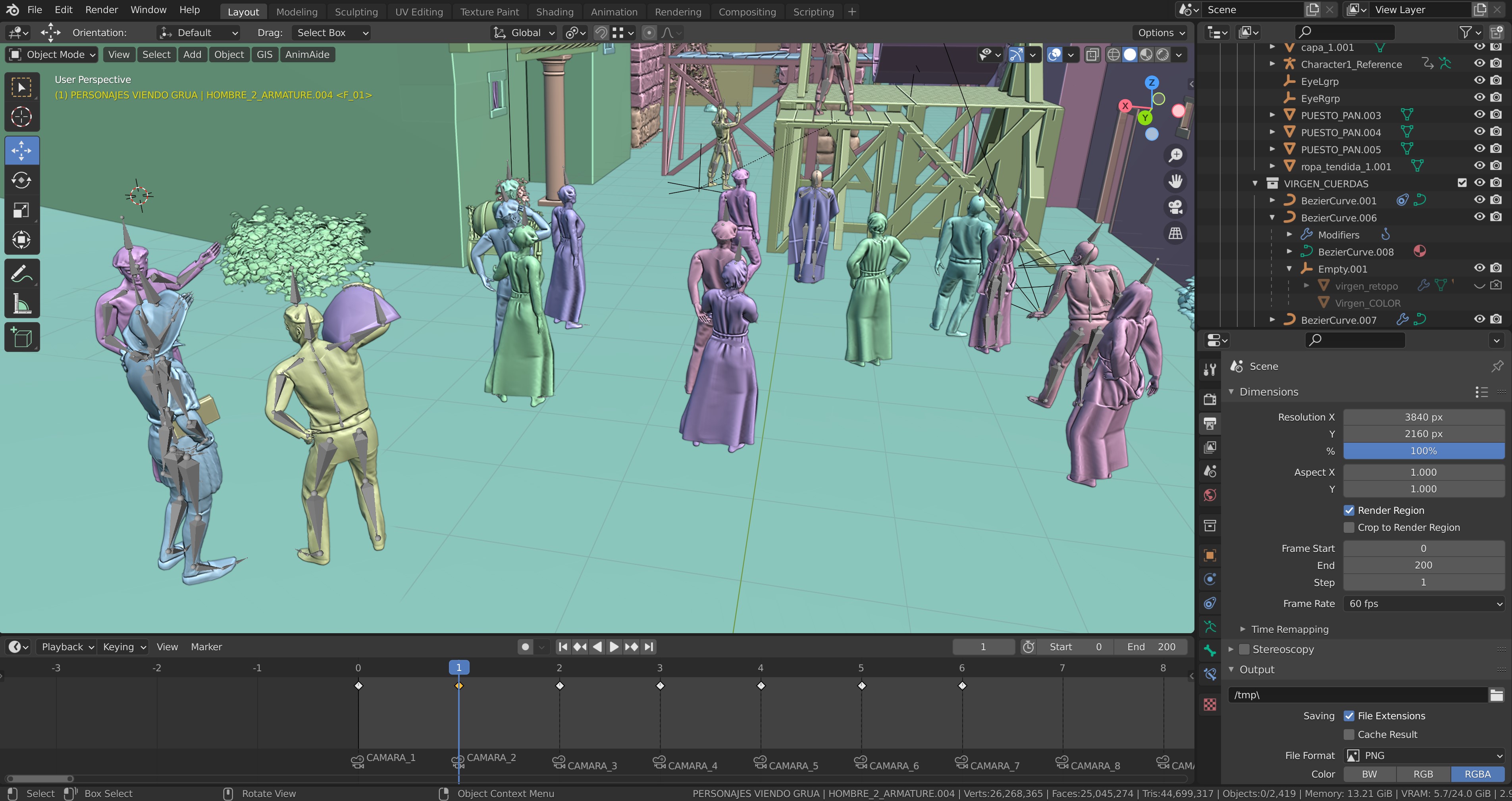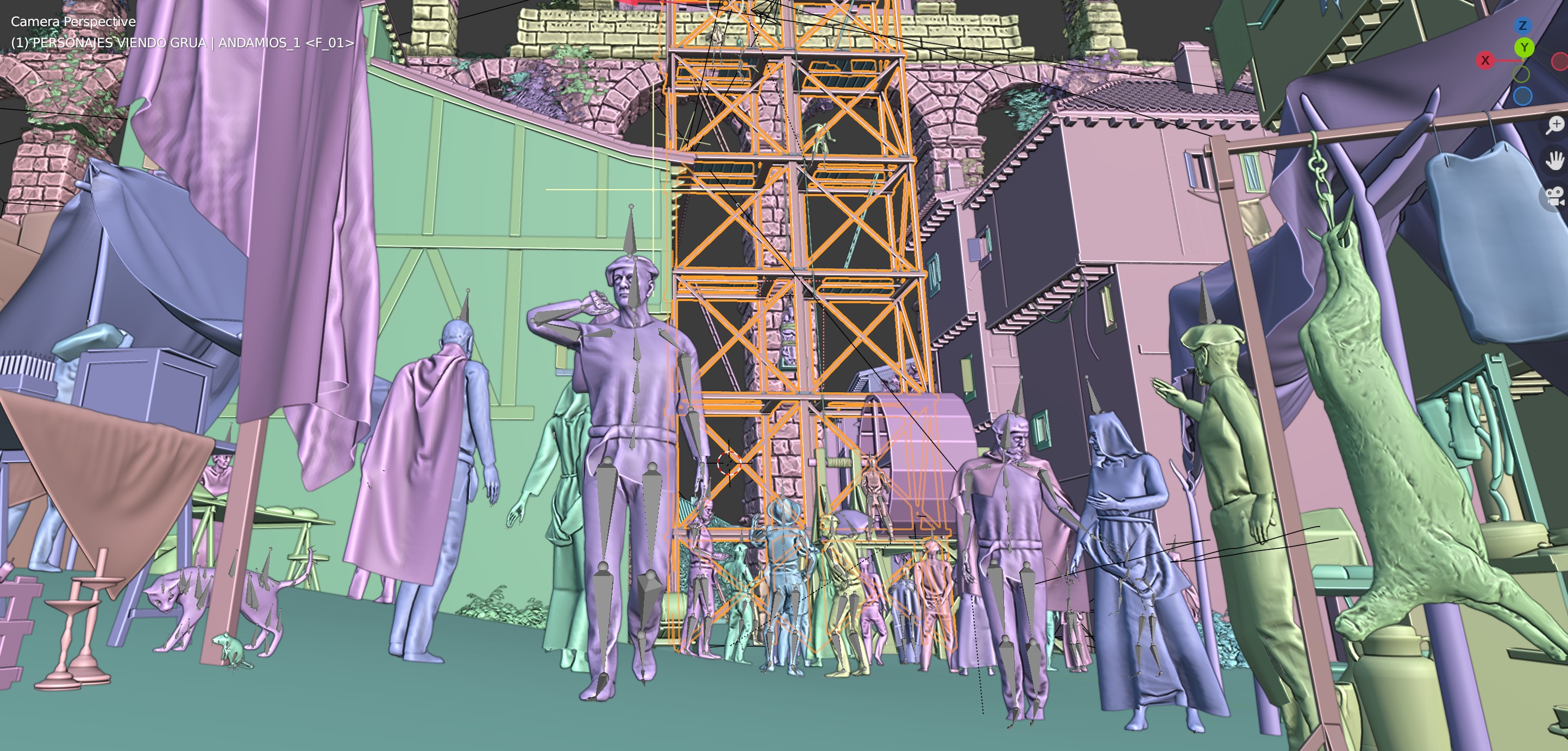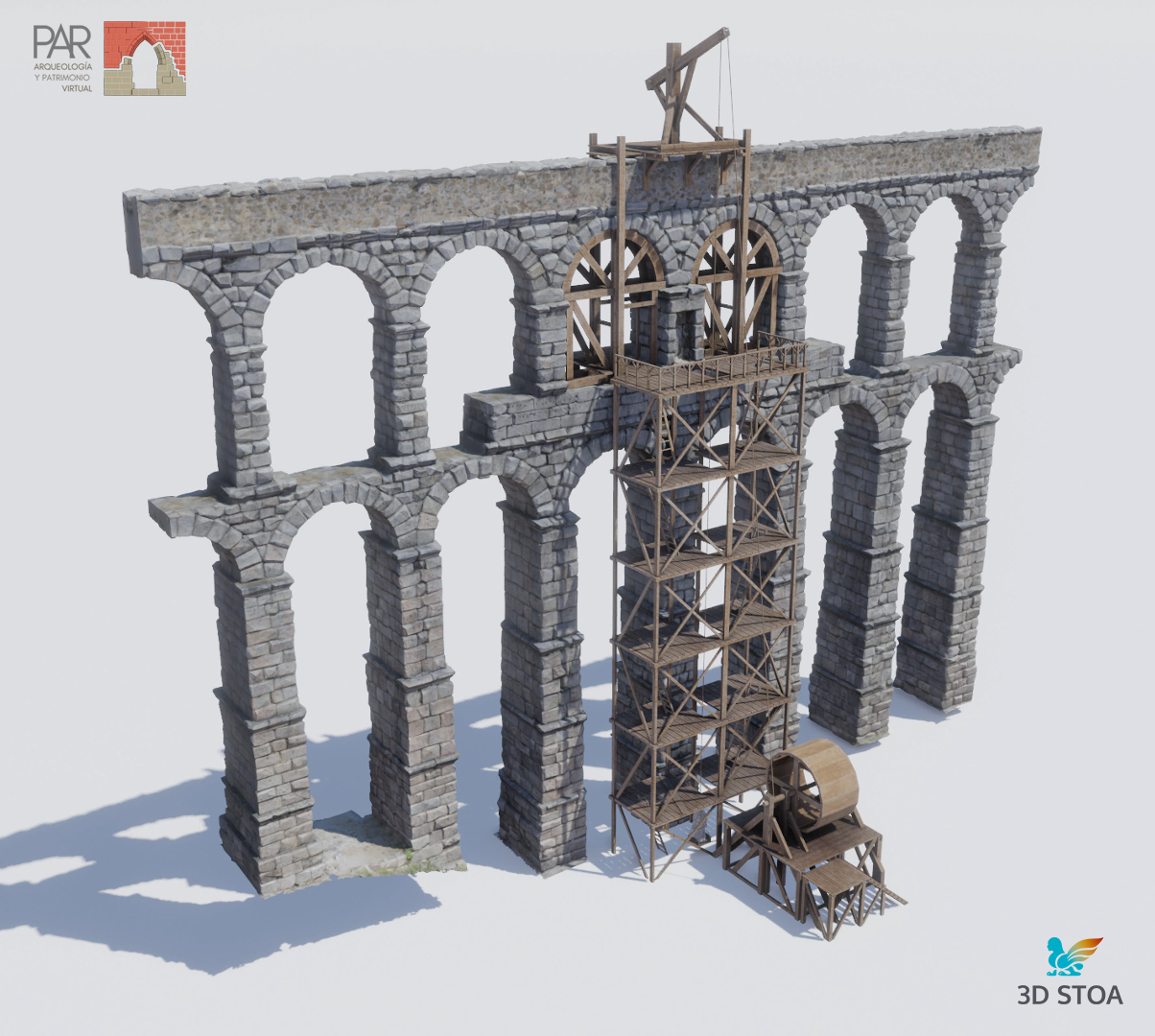 Posteriormente nos centramos en el añadido de detalles, siempre teniendo en cuenta los puntos de vista clave y el recorrido de la cámara en las animaciones que necesitábamos para el audiovisual. Organizar desde un principio los puntos de vista de los renderizados es fundamental para optimizar el trabajo a realizar. En este momento, además, fue muy importante definir la forma de los andamios y el funcionamiento de la grúa que levantaría las esculturas hasta la parte alta del Acueducto. Para ello seguimos varios tratados de la época entre los que destaca «Los veintiún libros de los ingenios y de las máquinas» de Juanelo Turriano, donde encontramos referencias muy interesantes para diseñar el sistema de izado de las estatuas. No olvidemos que la Virgen, por ejemplo, es de piedra caliza y pesa más de una tonelada.