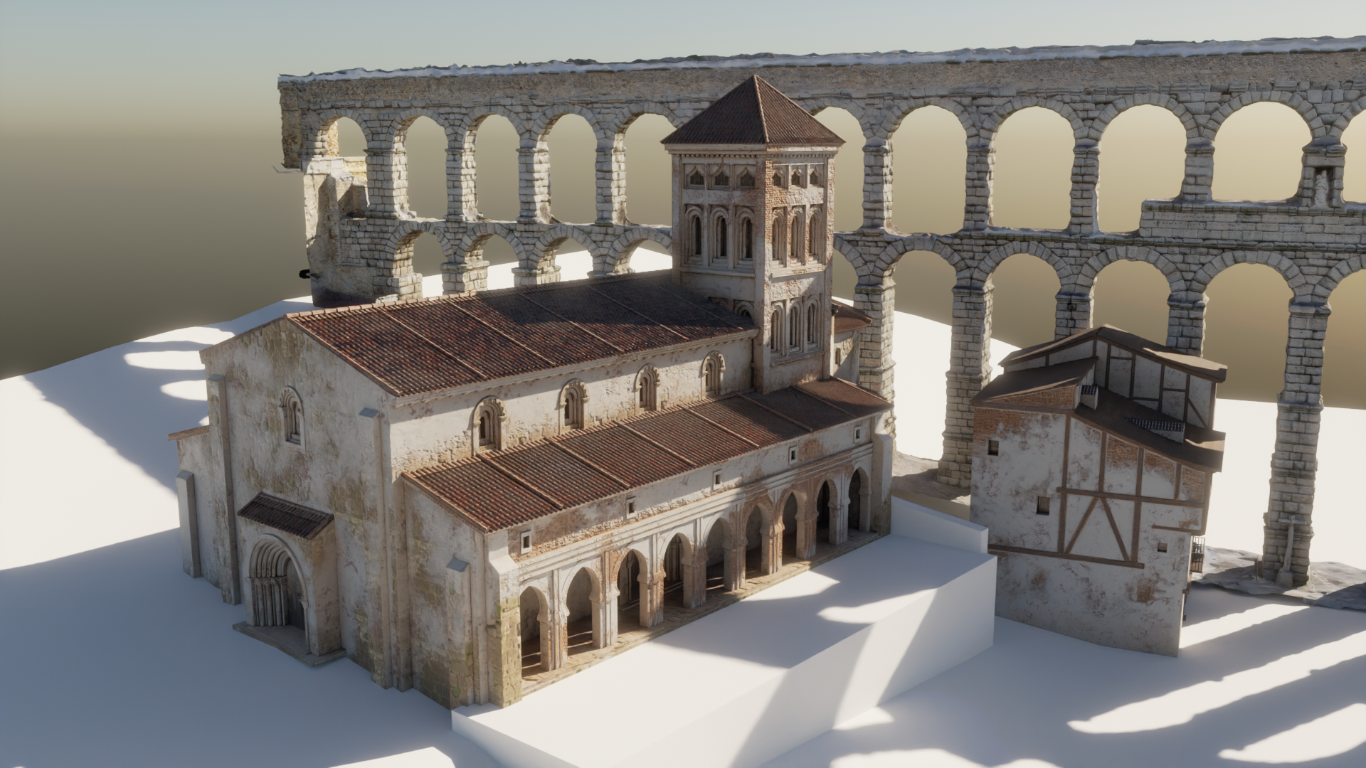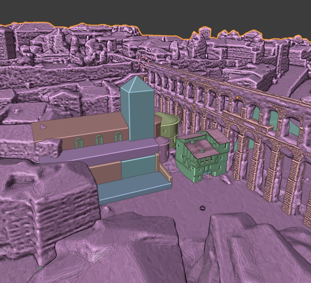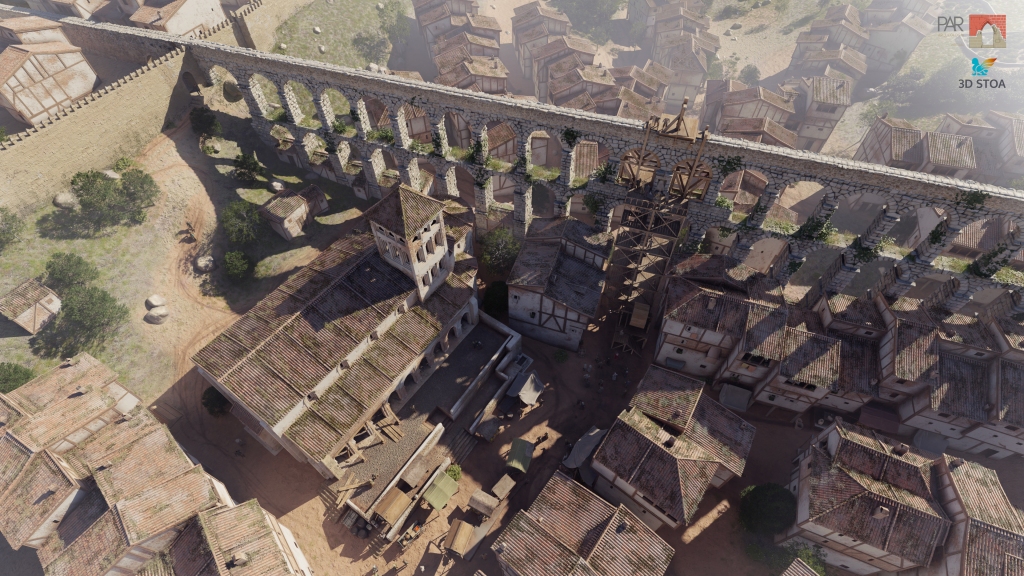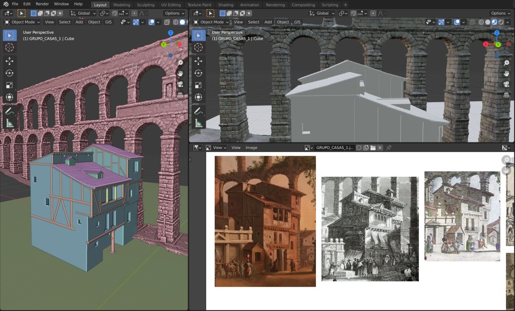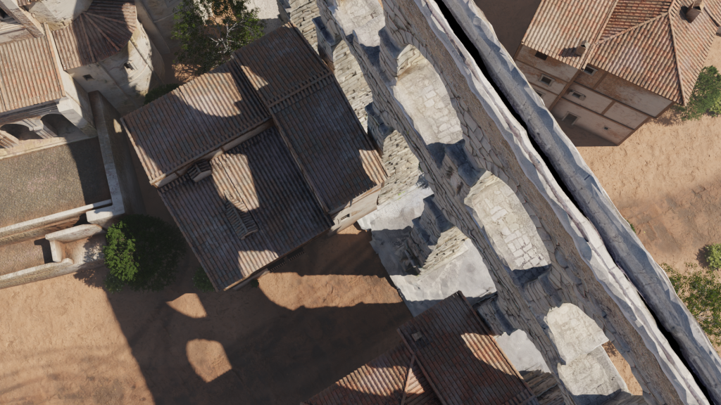 El primer paso consistió en la recreación de las casas más documentadas y de los volúmenes básicos de la iglesia de Santa Columba, siempre en relación con el modelo 3D escalado del Acueducto. Todo el trabajo de reconstrucción virtual se llevó a cabo en el software libre de diseño 3D Blender, mientras que parte de texturizado se realizó con Substance Painter.