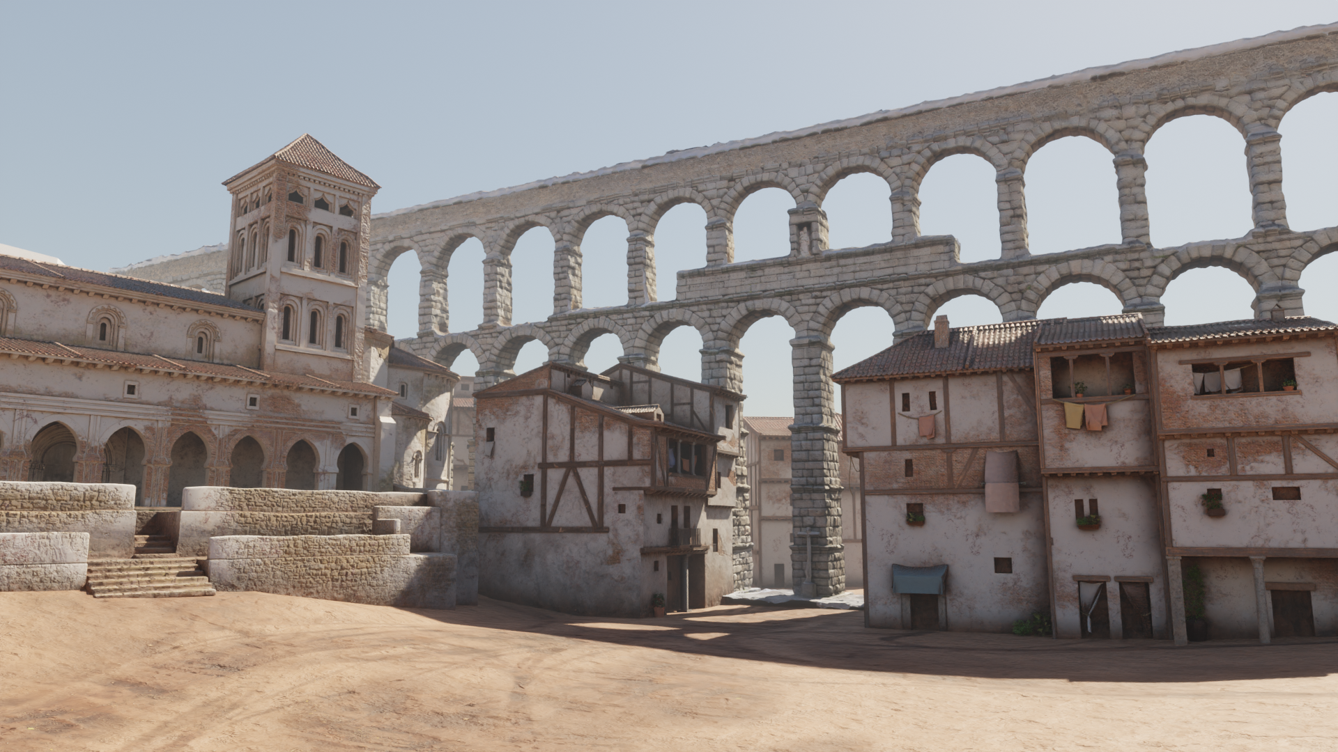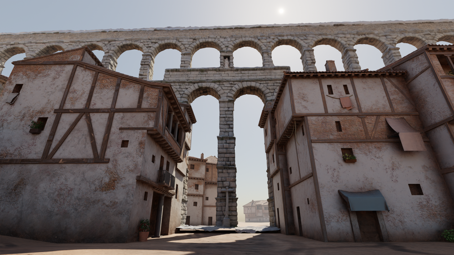 El último paso fue la obtención de los renderizados finales en Blender y su postproceso en Photoshop, buscando siempre conseguir una sensación atmosférica cálida y empática, que nos ayude a perdernos por los rincones de la Segovia de 1520. Podéis disfrutar de los renderizados finales en alta calidad desde aquí: https://www.artstation.com/artwork/nYkv2e