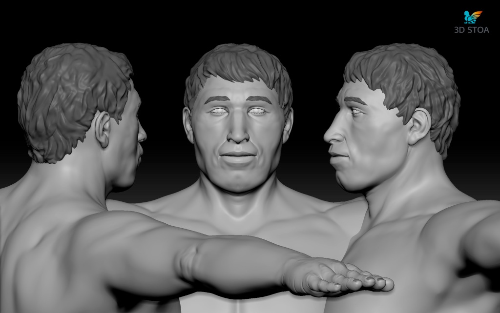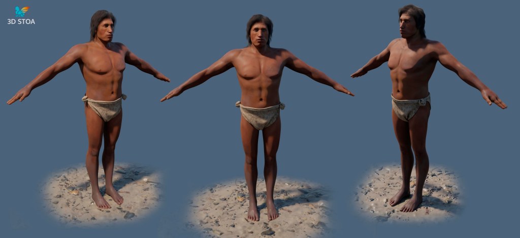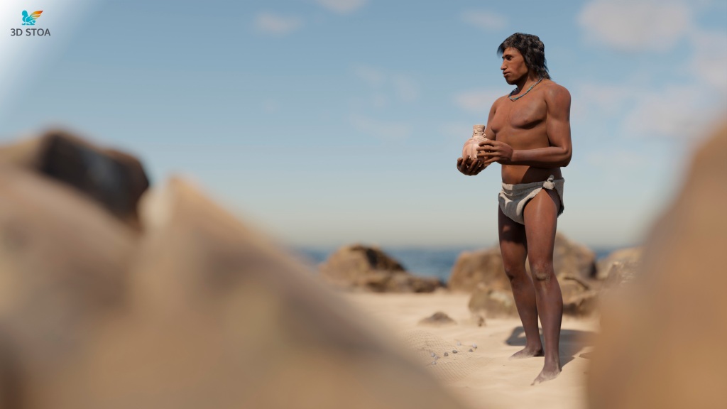 Dado que el proyecto se planteó también como una recreación de cuerpo completo del pescador, el siguiente paso fue trabajar la anatomía del cuerpo en Character Creator: se trataría de un hombre de entre 20 y 25 años de edad, de piernas ágiles, torso musculado y amplia espalda, un tipo de cuerpo adaptado a su trabajo como pescador y al acarreo de grandes peces. En todo el proceso de diseño del cuerpo, esculpido del rostro y texturizado debo agradecer el trabajo de nuestros colaboradores Elena Valero y Javier Durán, artistas 3D que se pelearon con distintos software hasta conseguir el resultado adecuado.