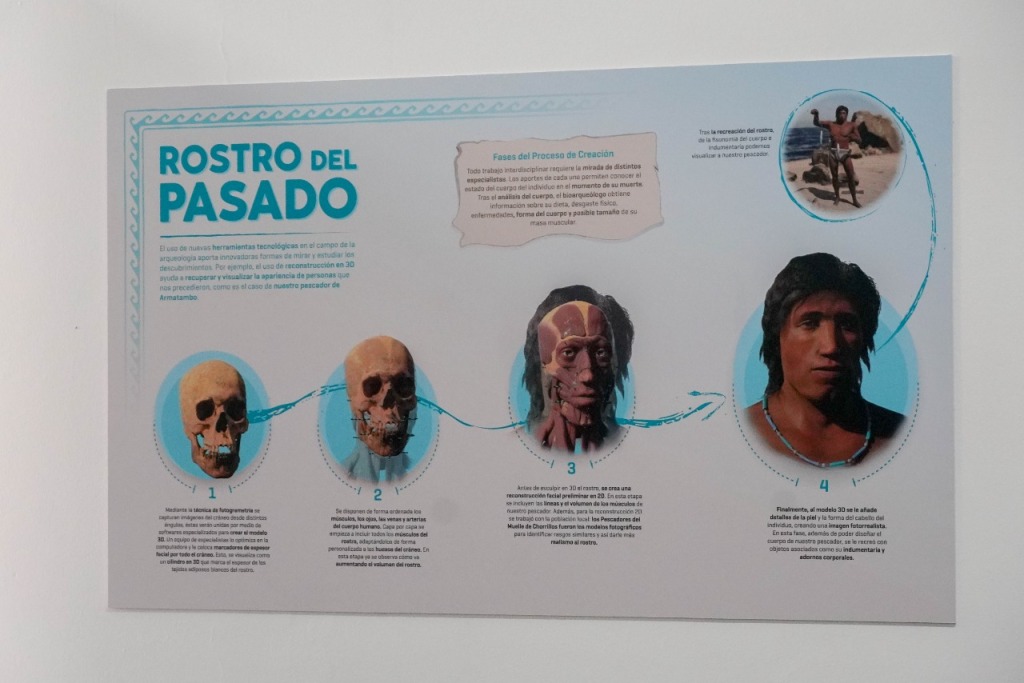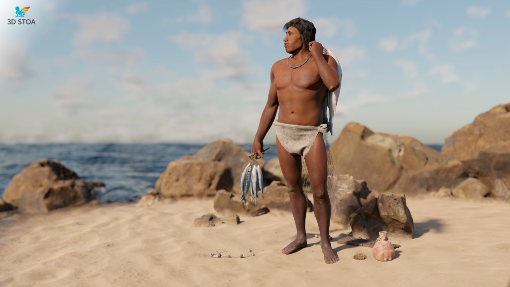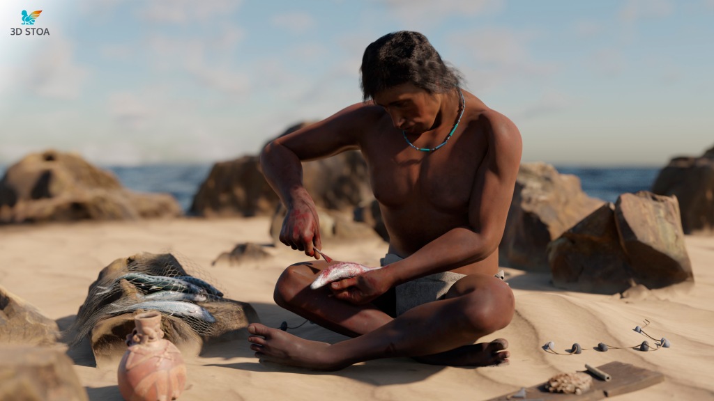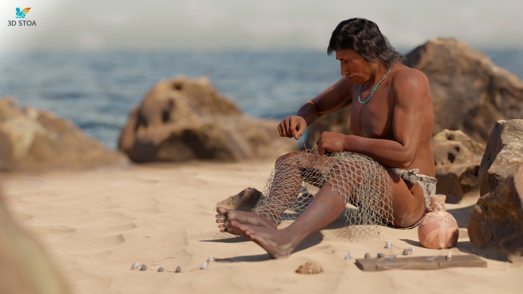 El resultado final es éste. Yaku se nos desvela como un hombre de rostro fuerte y mandíbula marcada. Bajo estas líneas podéis encontrar no solo la infografía que muestra el proceso de reconstrucción facial a partir del cráneo sino también una serie de escenas en las que el pescador aparece llevando a cabo algunas de las actividades que pudo realizar en vida: corte de pescado, cosido y uso de redes de pesca, etc.