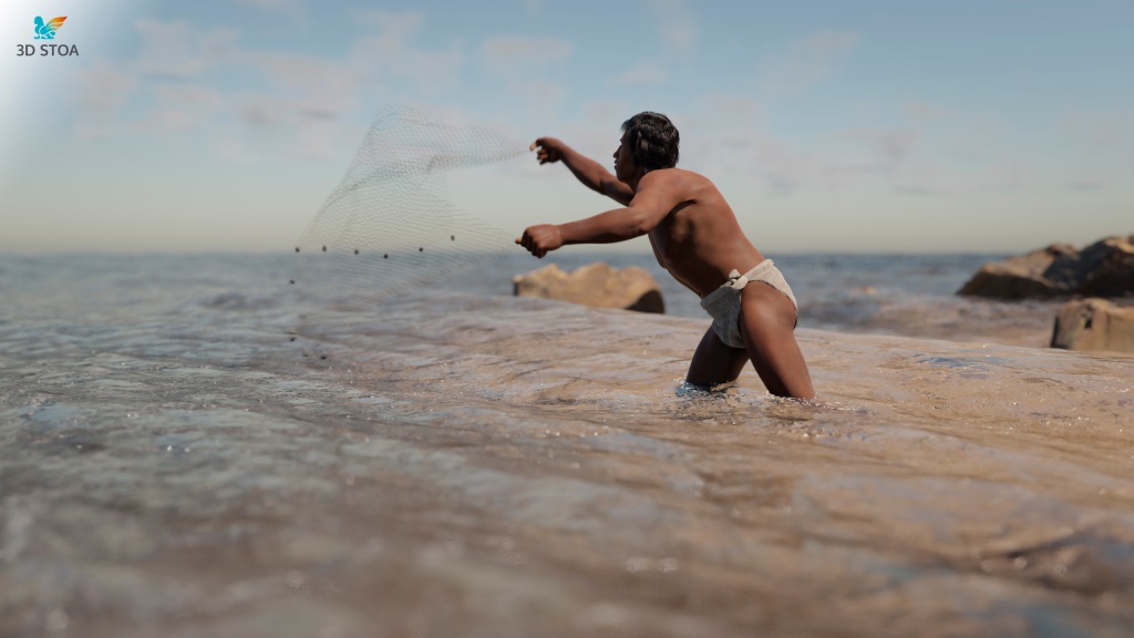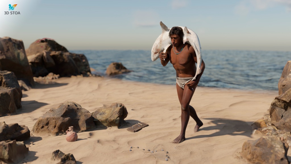 Además, hemos llevado a cabo varias animaciones, tanto del proceso de reconstrucción facial como de las actividades del pescador. Estas últimas han sido posibles gracias al uso del sistema de captura de movimiento de Rokoko.