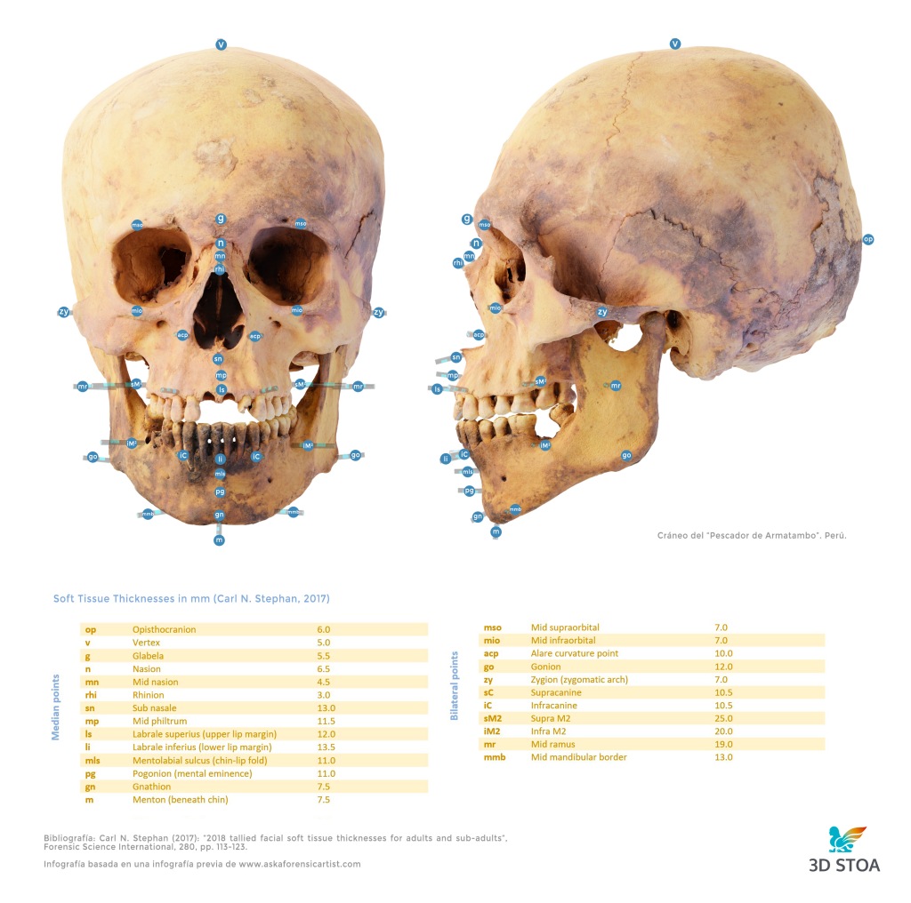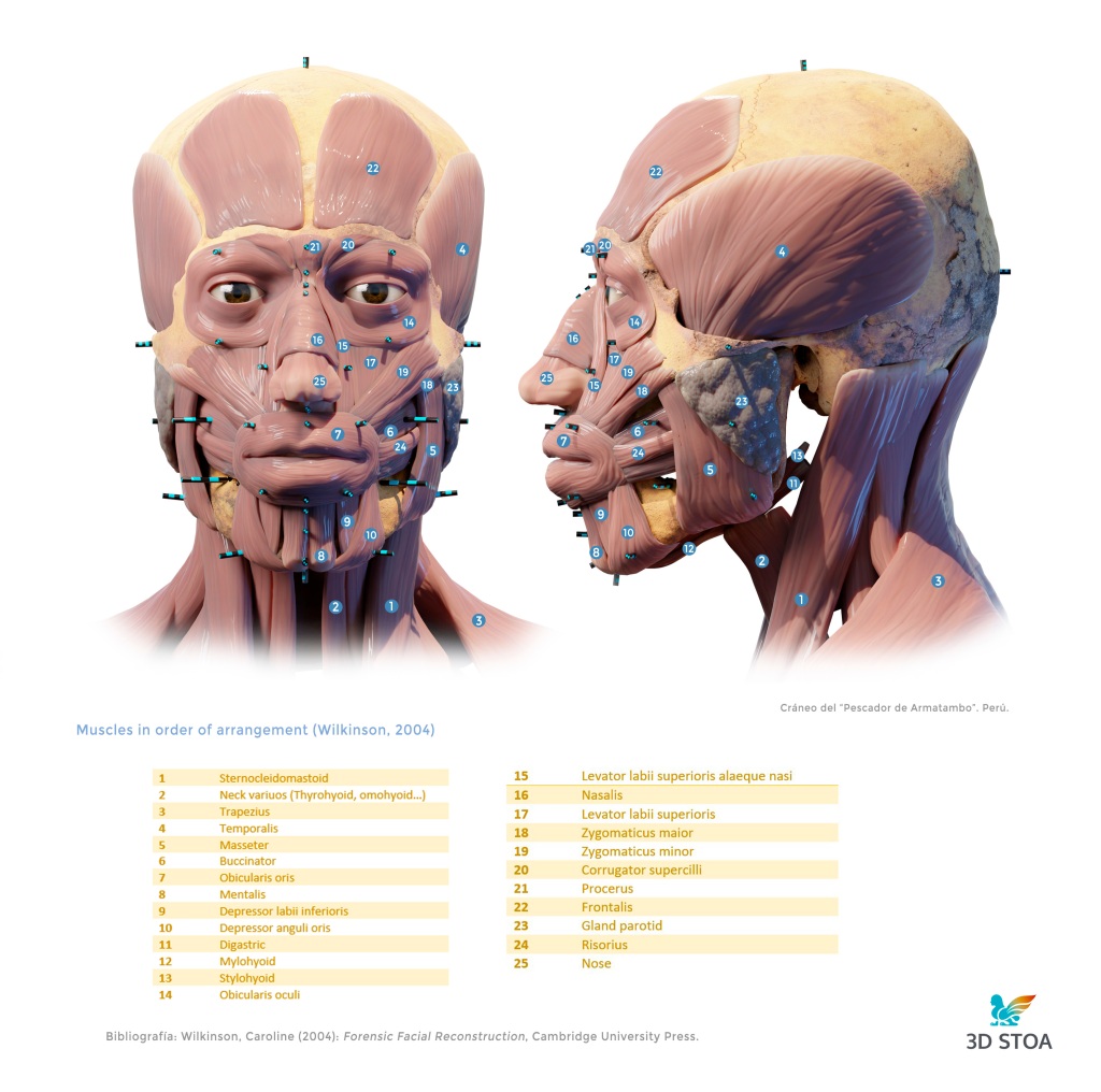 A partir del modelo 3D fotogramétrico del cráneo del individuo, facilitado por el arqueólogo Jesús Jovelos Bahamonde, de Cálidda, llevamos a cabo en Blender el proceso de reconstrucción facial forense del rostro, que comienza con el añadido de los marcadores de espesor facial, para lo cual nos basamos en la tabla de Carl N. Stephan (2017), y, posteriormente, el añadido de los músculos, proceso en el que seguimos el método de Wilkinson (2004).