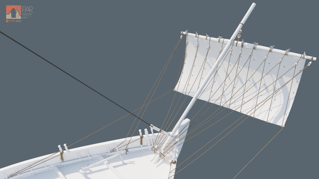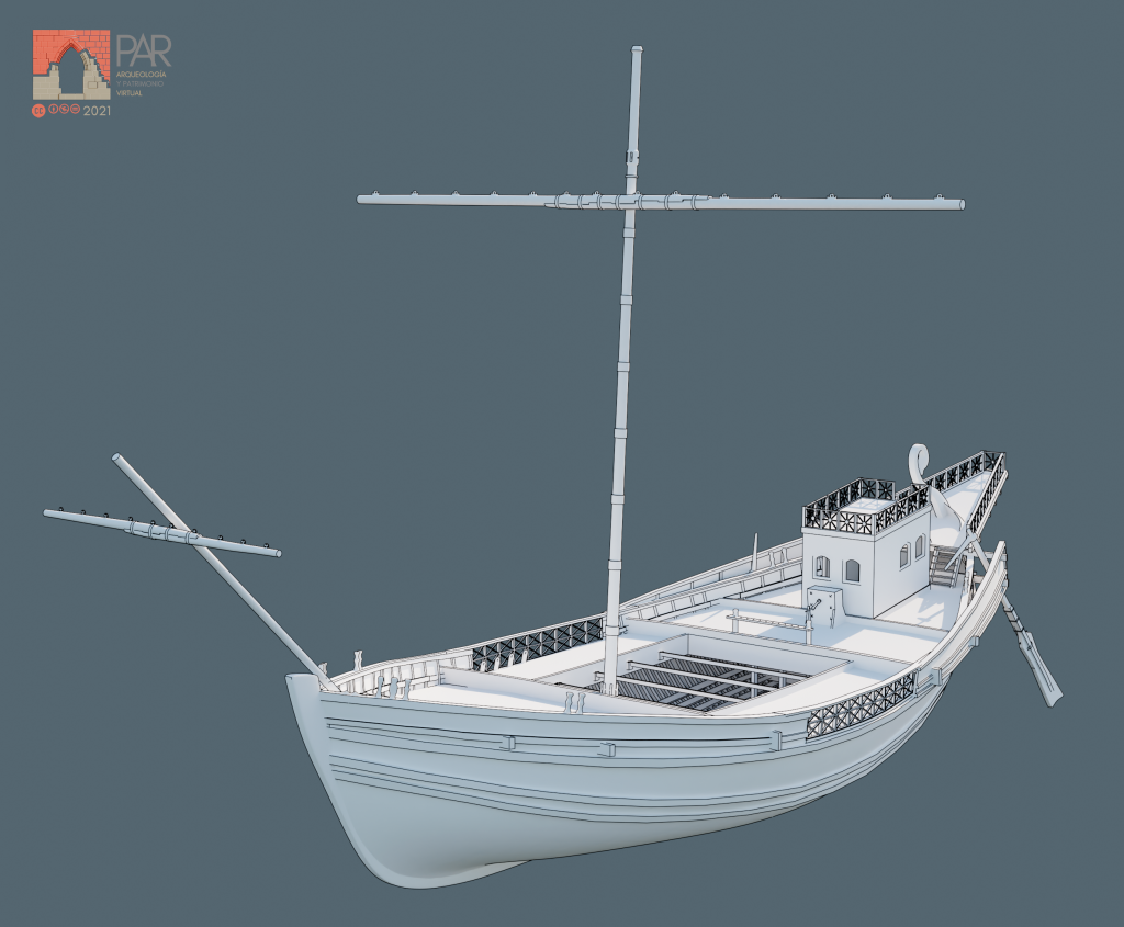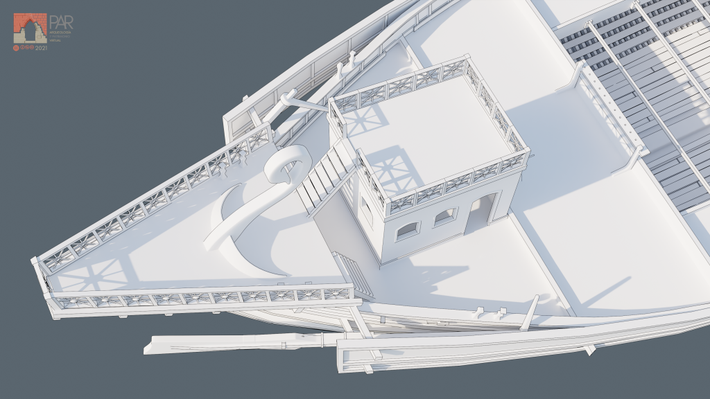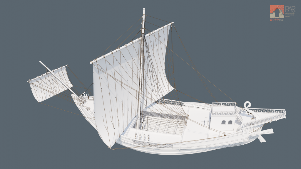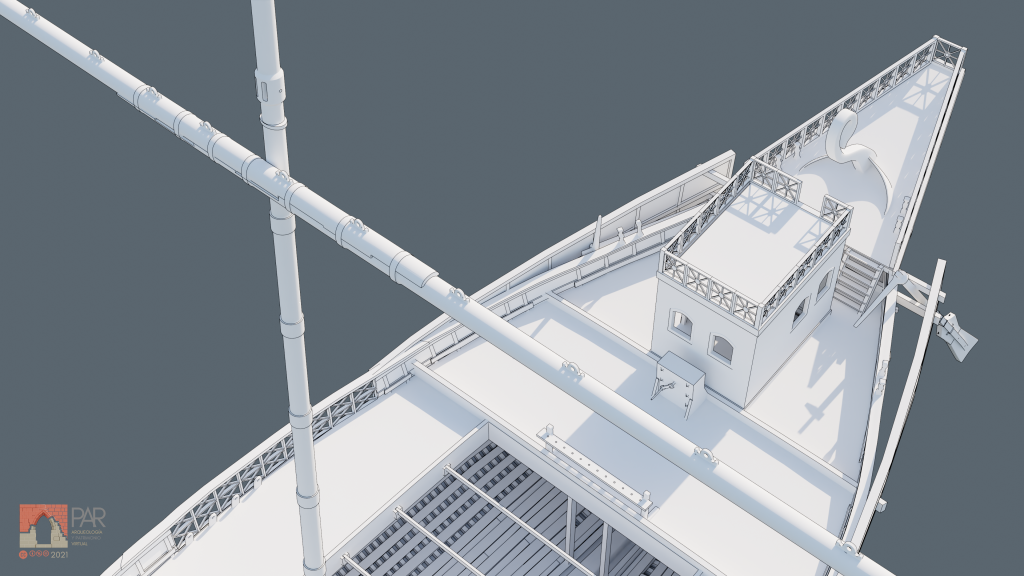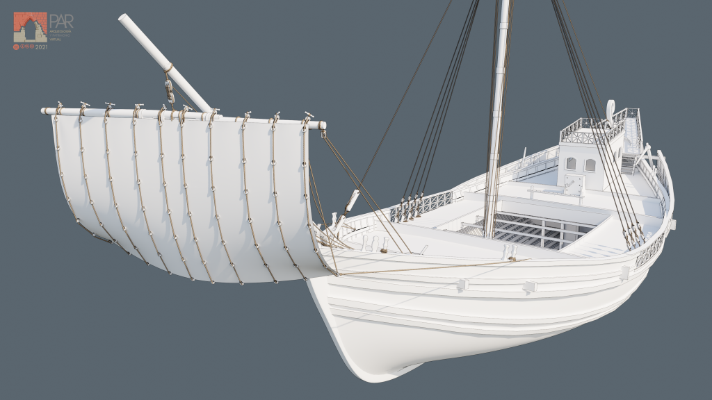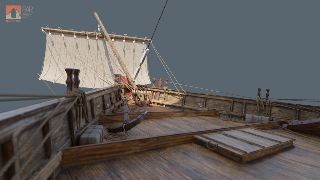 El proyecto comenzó entre planos, pensando de forma conjunta junto con Vladimir Herrero y Carlos de Juan, la forma general del casco que, en base a simulaciones teóricas preexistentes, condicionaría la construcción simultánea de la reconstrucción virtual y de una maqueta de madera. A partir de entonces, con una hipótesis básica planteada, Vladimir avanzó con la construcción de la maqueta de madera que, una vez definida de forma general, documentaríamos mediante fotogrametría en 3D y utilizaríamos como referencia métrica para ajustar a la perfección nuestro modelo digital. No escatimamos en detalles: teníamos que reproducir de forma precisa tanto el exterior como el interior del navío para comprender y mostrar su forma de navegar y la disposición de su carga o estiba. En este punto tuve que empaparme de terminología náutica -de la que soy un completo neófito- para poder comunicarme con el resto del equipo y entender qué partes había que diseñar y la forma que debían tener.