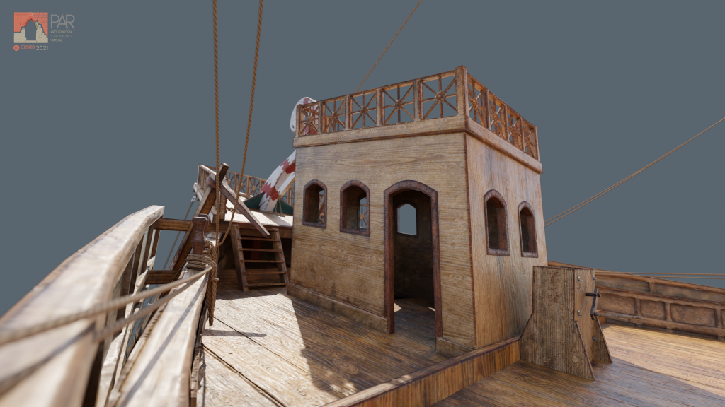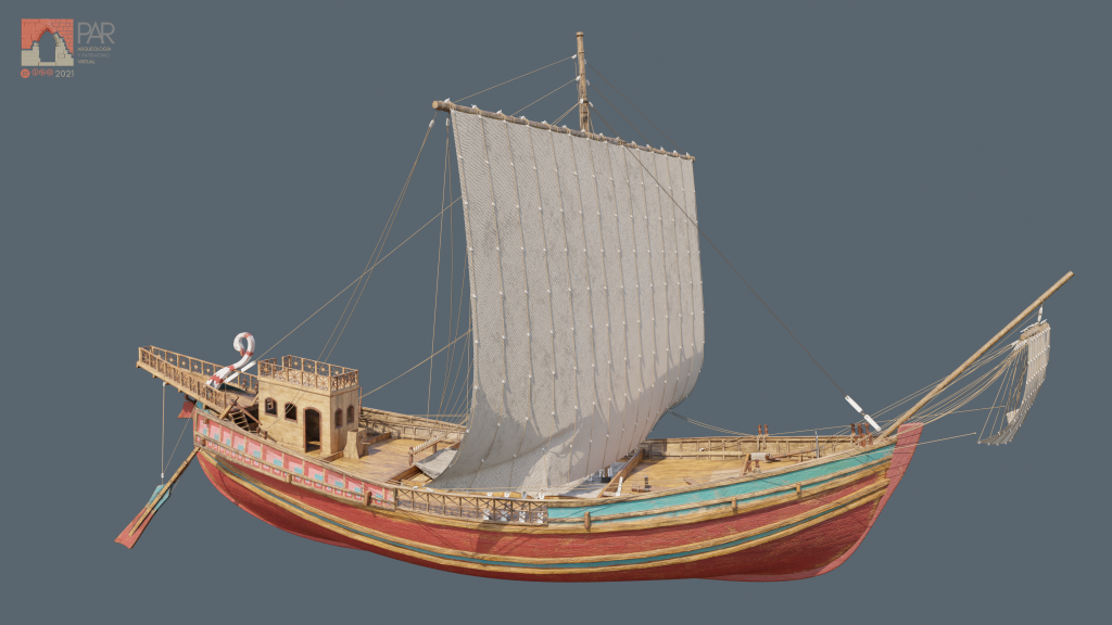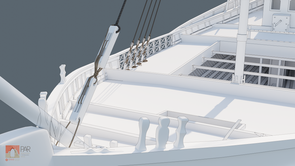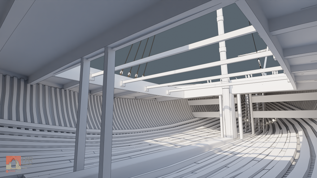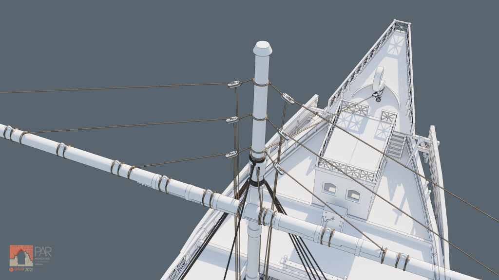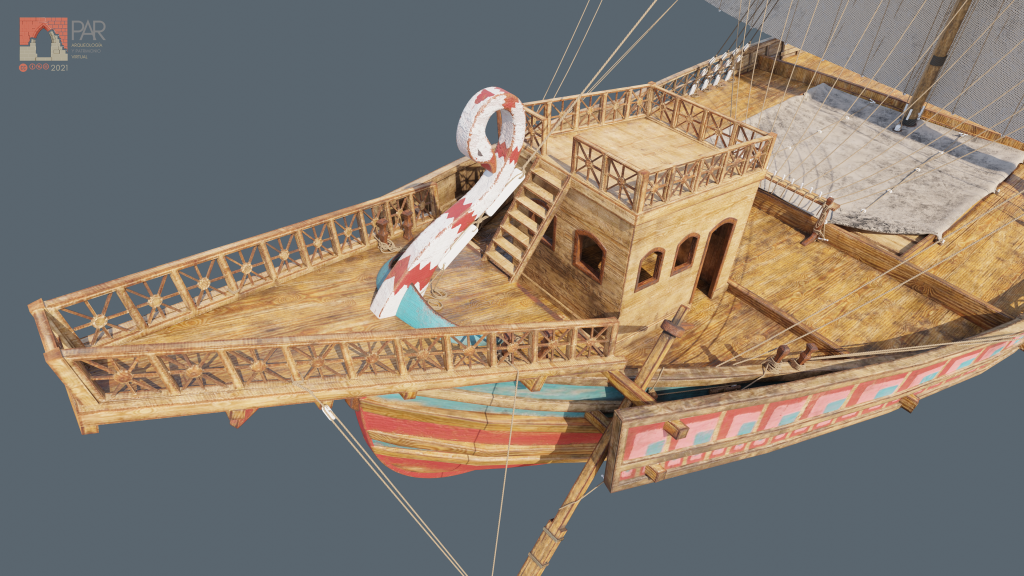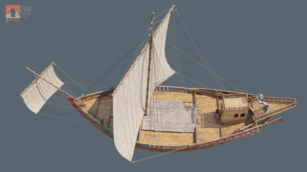 El proyecto comenzó entre planos, pensando de forma conjunta junto con Vladimir Herrero y Carlos de Juan, la forma general del casco que, en base a simulaciones teóricas preexistentes, condicionaría la construcción simultánea de la reconstrucción virtual y de una maqueta de madera. A partir de entonces, con una hipótesis básica planteada, Vladimir avanzó con la construcción de la maqueta de madera que, una vez definida de forma general, documentaríamos mediante fotogrametría en 3D y utilizaríamos como referencia métrica para ajustar a la perfección nuestro modelo digital. No escatimamos en detalles: teníamos que reproducir de forma precisa tanto el exterior como el interior del navío para comprender y mostrar su forma de navegar y la disposición de su carga o estiba. En este punto tuve que empaparme de terminología náutica -de la que soy un completo neófito- para poder comunicarme con el resto del equipo y entender qué partes había que diseñar y la forma que debían tener.