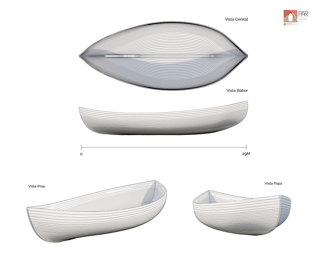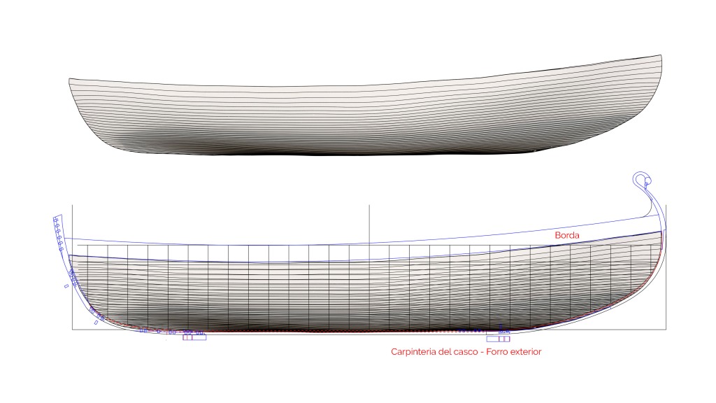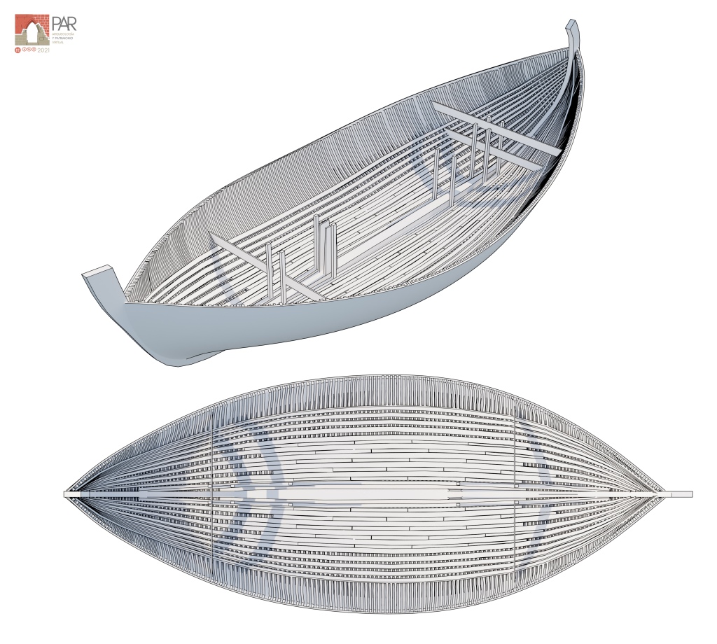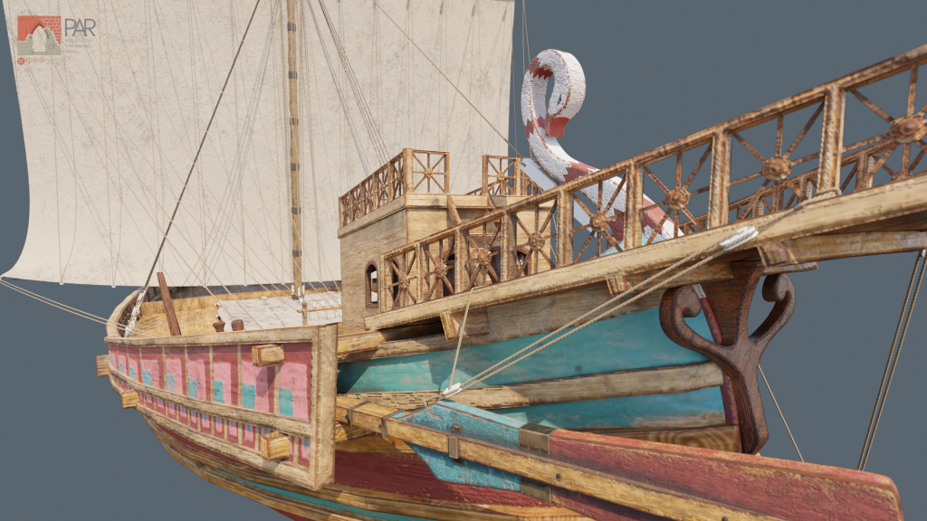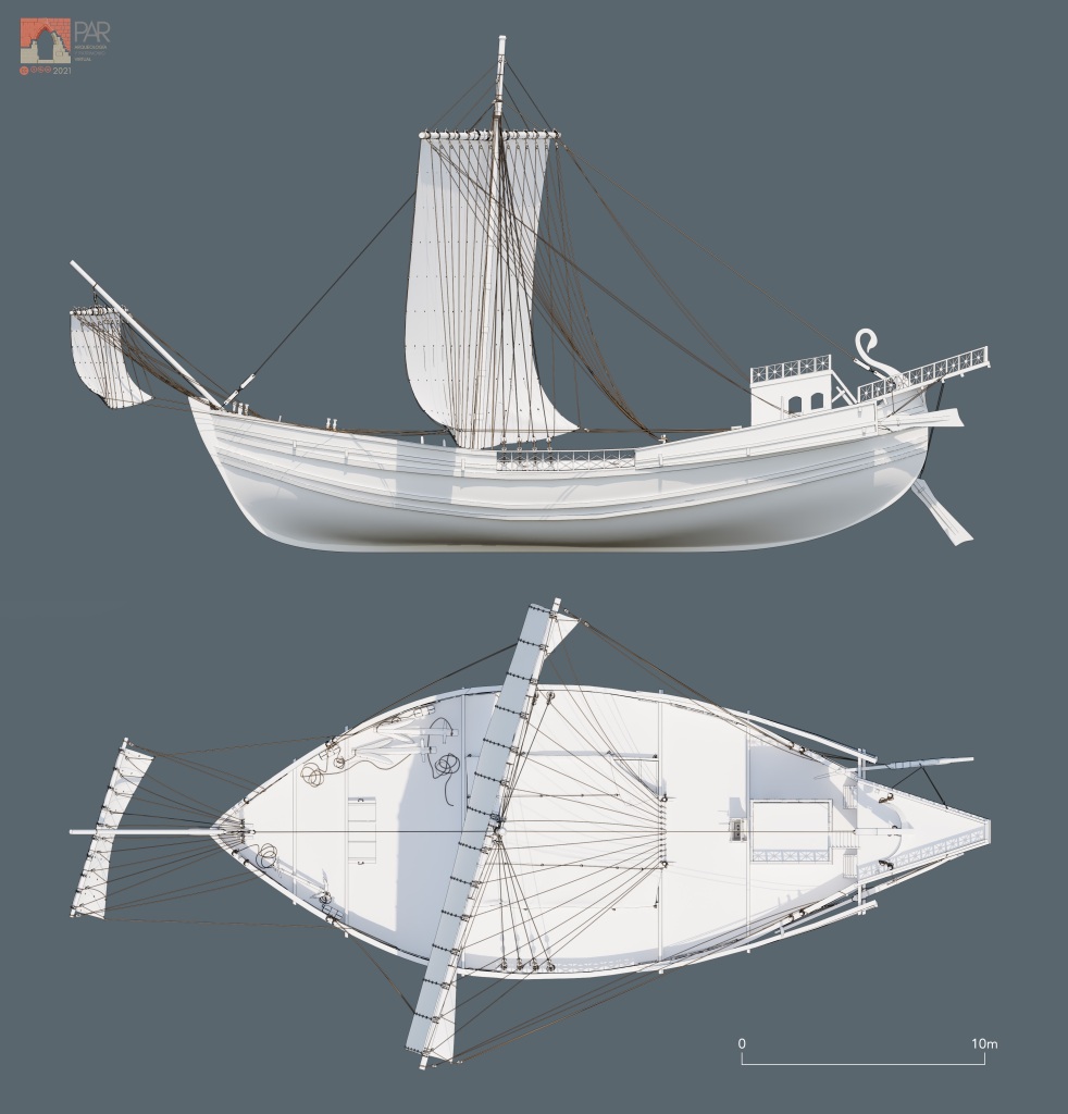 El proyecto comenzó entre planos, pensando de forma conjunta junto con Vladimir Herrero y Carlos de Juan, la forma general del casco que, en base a simulaciones teóricas preexistentes, condicionaría la construcción simultánea de la reconstrucción virtual y de una maqueta de madera. A partir de entonces, con una hipótesis básica planteada, Vladimir avanzó con la construcción de la maqueta de madera que, una vez definida de forma general, documentaríamos mediante fotogrametría en 3D y utilizaríamos como referencia métrica para ajustar a la perfección nuestro modelo digital. No escatimamos en detalles: teníamos que reproducir de forma precisa tanto el exterior como el interior del navío para comprender y mostrar su forma de navegar y la disposición de su carga o estiba. En este punto tuve que empaparme de terminología náutica -de la que soy un completo neófito- para poder comunicarme con el resto del equipo y entender qué partes había que diseñar y la forma que debían tener.