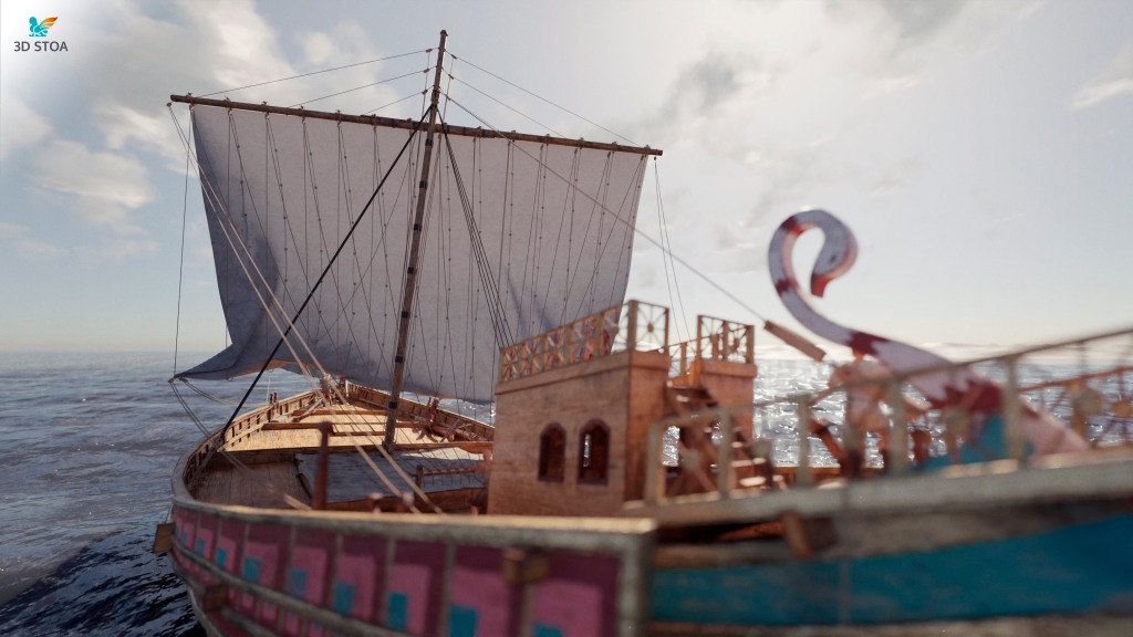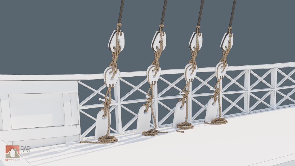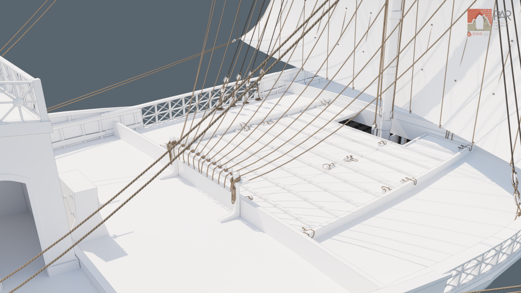 Comenzó entonces el proceso de texturizado, que llevamos a cabo en Adobe Substance 3D Painter. El objetivo, una vez añadimos detalles y otros objetos (como las anclas) era obtener un acabado lo más realista posible pero manteniendo un acabado idéntico al de la maqueta de madera que, simultáneamente, se estaba llevando a cabo. De este modo, cuando el visitante pueda ver ambos productos en la exposición permanente del Vilamuseu, podrá entender sin problema que son el mismo barco.