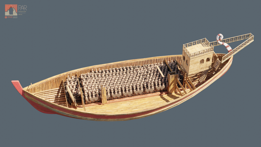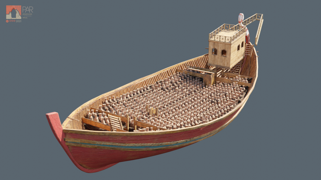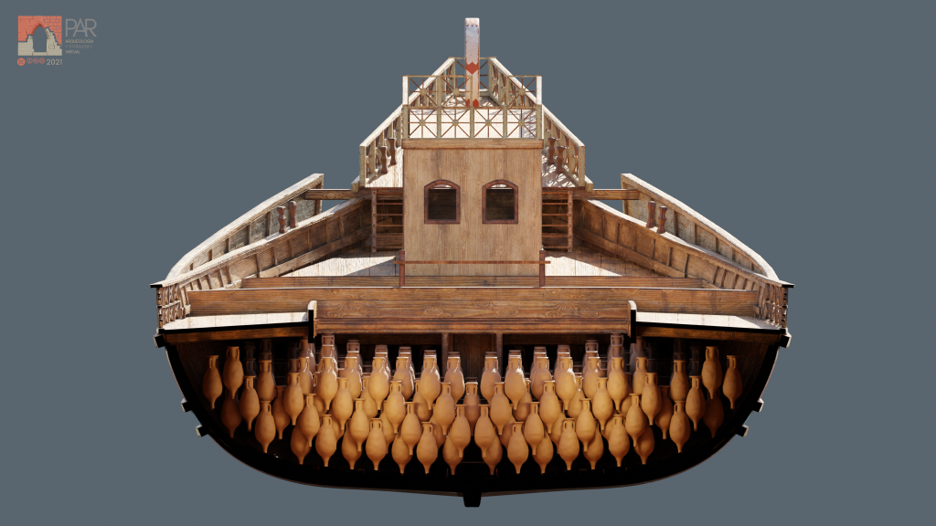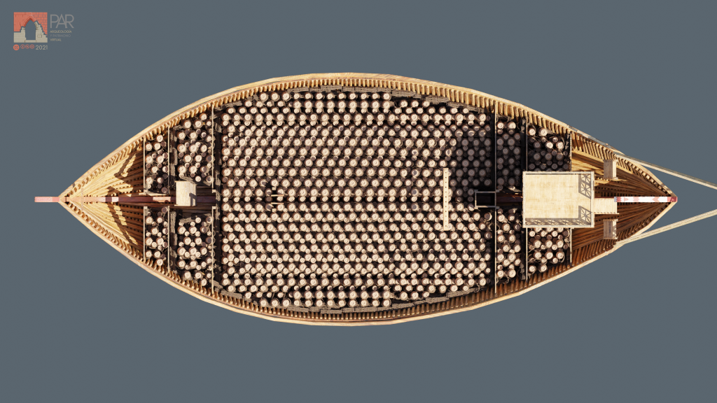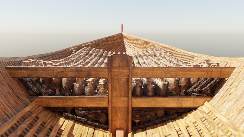 Con la arquitectura construida y el barco texturizado, era el momento de llenarlo de ánforas. Éstas (recreadas en base a las halladas en las excavaciones) se disponían hasta en 4 niveles superpuestos en algunas de las partes del barco, formado un impresionante entramado de cerámica que permitía optimizar el espacio y transportar un cargo verdaderamente importante. Se disponían recubiertas previamente de una red de sarmientos vegetales que amortiguaban los golpes y sujetas por parte de la viguería del propio barco. El objetivo era evitar que estos contenedores pudieran caerse o quebrarse durante la navegación. Los cálculos que podemos hacer gracias a este modelo 3D nos hablan de que el Bou Ferrer pudo cargar cerca de 2000 ánforas, aunque podrían ser más dependiendo del tamaño de las mismas. Podéis haceros una idea de cómo estaba dispuesto el cargamento en el barco gracias a las infografías que mostramos bajo estas líneas.