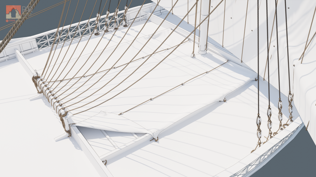 El siguiente paso fue la creación de las velas, con sus cabos, envergues y brioles. Todo el trabajo de diseño 3D está realizado en Blender, donde también utilicé sistemas de simulación de telas, y múltiples objetos emparentados a vértices y a «garfios» (hooks), para conseguir un resultado realista a la hora de animar las velas con el viento, algo necesario para la animación 3D posterior. Finalmente, obtuvimos el modelado definitivo del barco, que aquí podéis ver bajo estas líneas en sendas vistas ortográficas, cenital y de babor.