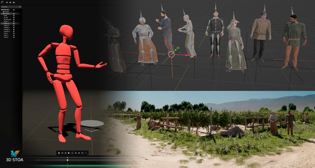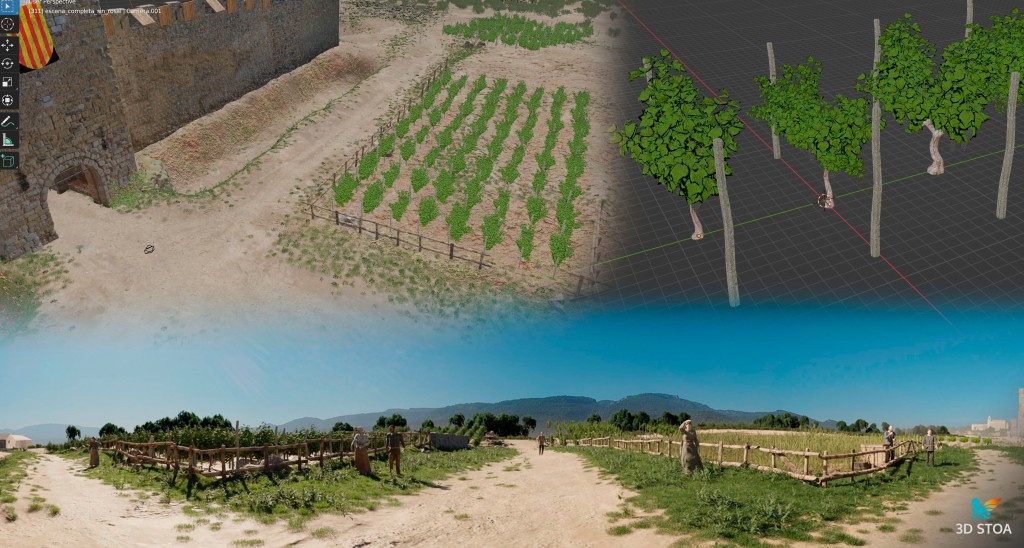 Para ambientar la escena en la edad media eliminamos todas las viviendas actuales y recreamos el foso que delimitaría la línea de muralla, así como un espacio de huertas, viñedos y cultivos, propios de los espacios extramuros de una ciudad medieval. En cualquier caso, trabajamos siempre teniendo en cuenta el punto de vista de la cámara 360º para optimizar el diseño de entornos y modelos y obtener el mejor resultado posible con el menor desempeño de recursos.