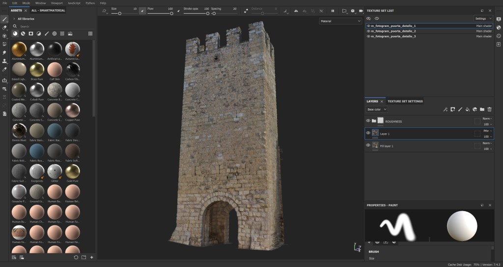 El modelo fotogramétrico resultante fue recortado y editado para adaptarse perfectamente a la escena, eliminado aquellos añadidos posteriores presentes en la textura del objeto y retirando elementos como letreros modernos para obtener la imagen medieval de la estructura. Para llevar a cabo este proceso optimizamos las mallas en Blender y utilizamos Substance Painter para conseguir los mapas de texturas que nos permitieran conseguir un resultado perfecto del modelo 3D final.