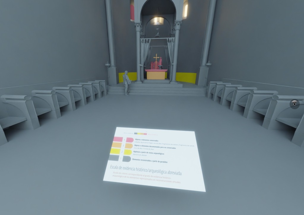 La escala de evidencia histórico-arqueológica es una herramienta que nos permite entender, de un vistazo, mediante una gama de colores de tonos más fríos a tonos más cálidos, el nivel de evidencia de cada parte de una reconstrucción virtual. En este caso, hemos optado por una gama de cuatro colores: 1) gris, asociado a elementos reconstruidos a partir de paralelos; 2) amarillo, relacionado con la hipótesis a partir de restos arqueológicos; 3) naranja, que hace referencia a objetos o elementos documentados pero no conservados; y 4) rosa, con el que se representan los objetos o elementos conservados.