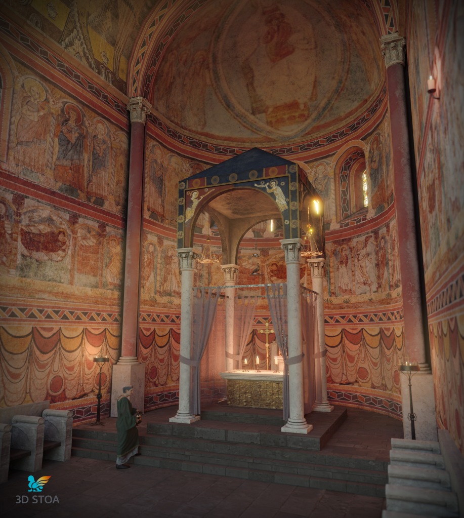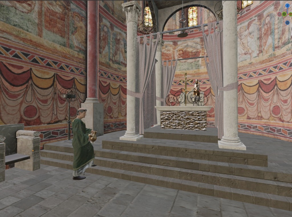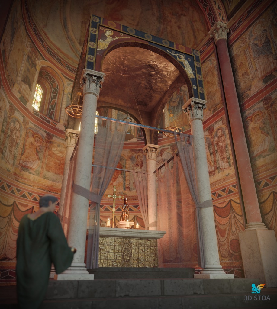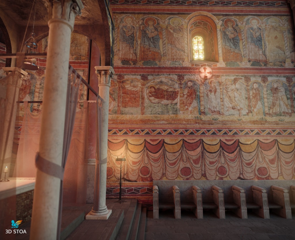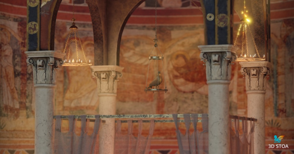 Además, llevamos a cabo a partir de paralelos otros elementos como los asientos de los canónicos, el ciborio o baldaquino (para el que nos basamos en el Baldaquí de Toses, MNAT), los candelabros, las lámparas, el frontal de altar o la paloma eucarística. Todos estos elementos aportan realismo y viveza a la escena, permitiéndonos recuperar el ambiente original del presbiterio románico.