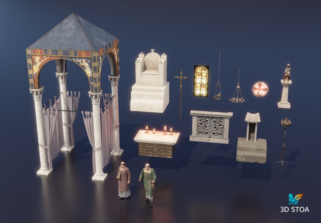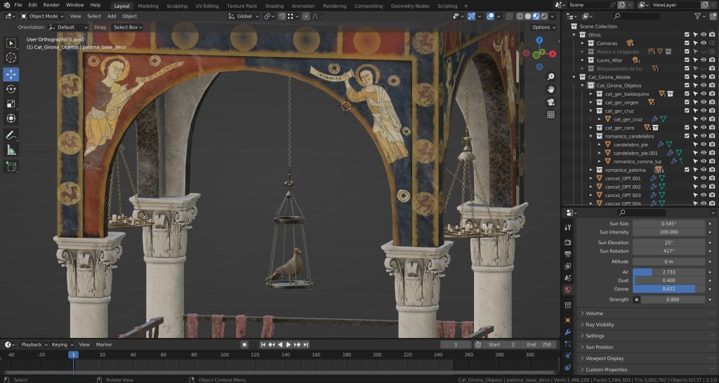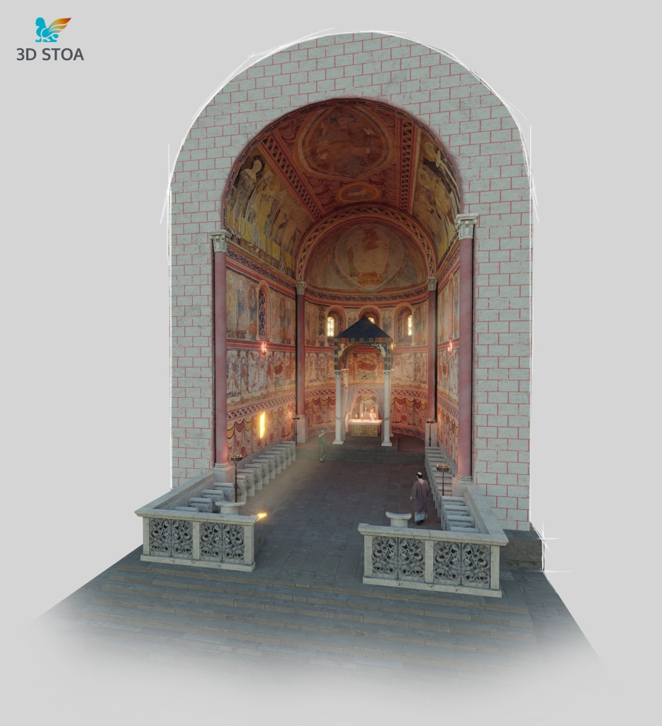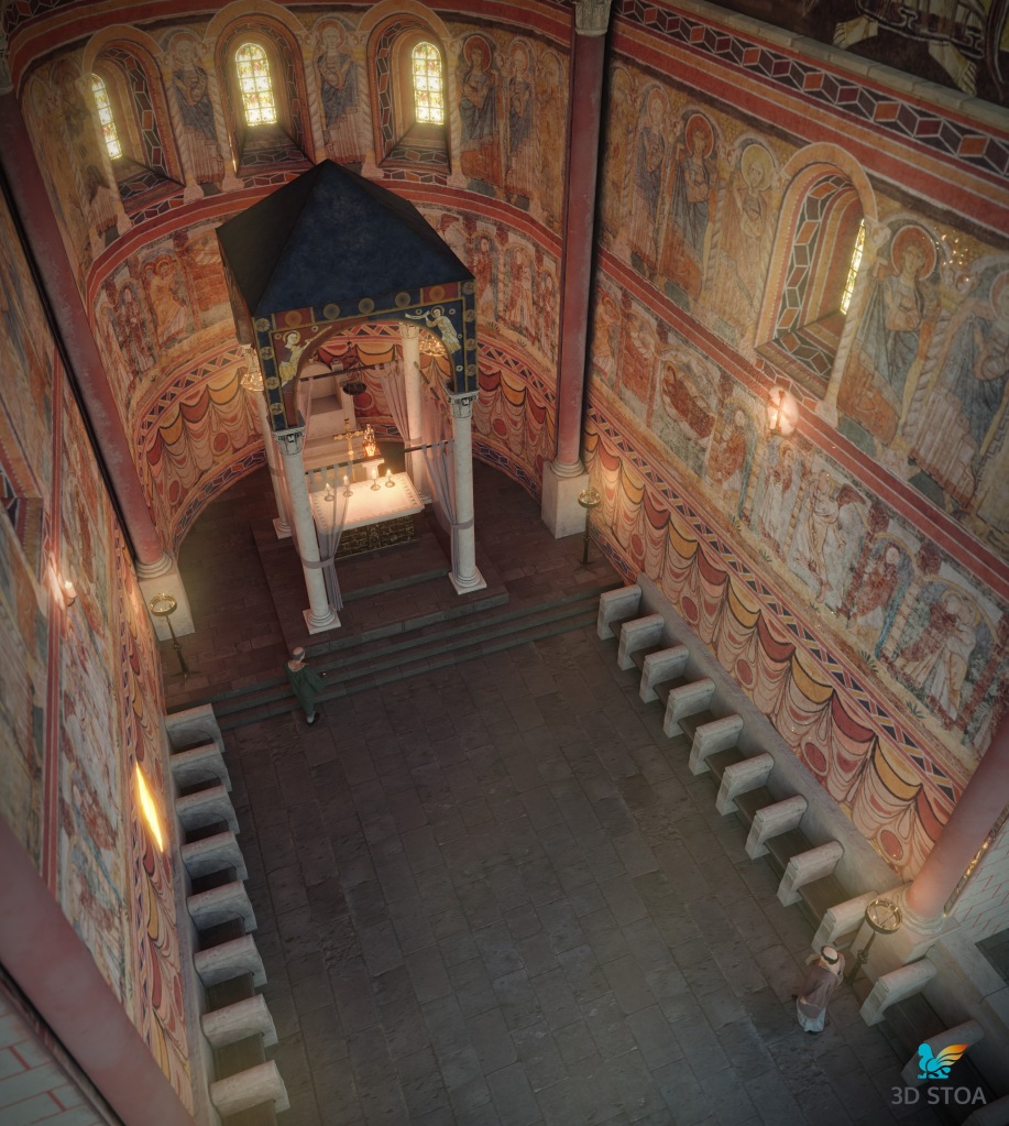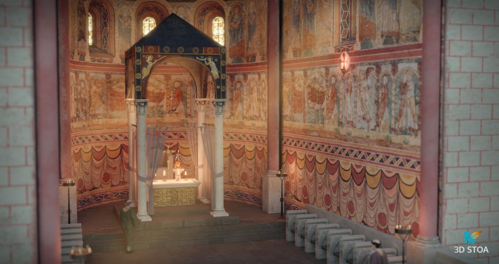 Además, llevamos a cabo a partir de paralelos otros elementos como los asientos de los canónicos, el ciborio o baldaquino (para el que nos basamos en el Baldaquí de Toses, MNAT), los candelabros, las lámparas, el frontal de altar o la paloma eucarística. Todos estos elementos aportan realismo y viveza a la escena, permitiéndonos recuperar el ambiente original del presbiterio románico.