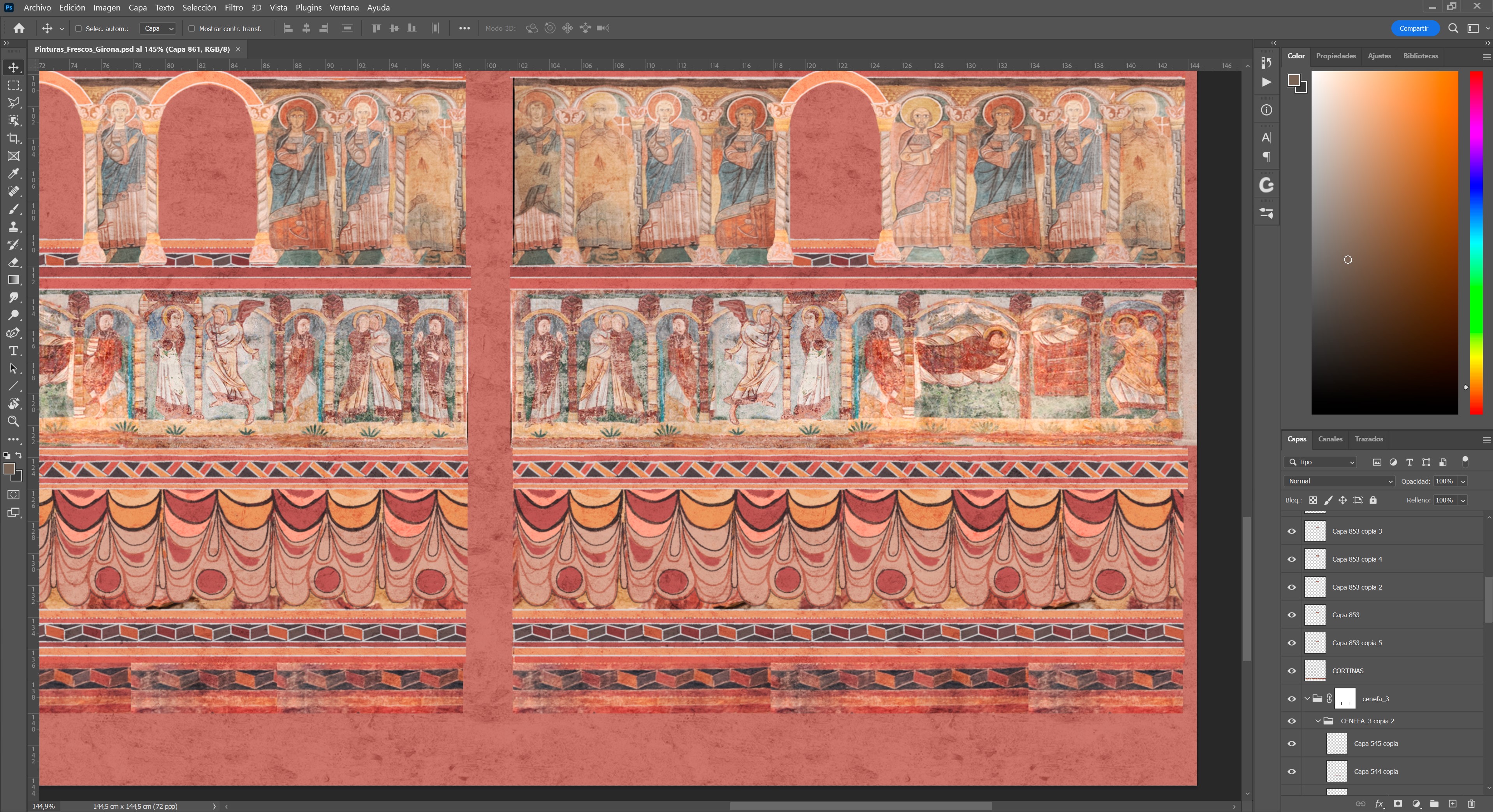 Un presbiterio románico tan importante como el de la catedral de Girona estaría decorado por completo con pinturas en sus paredes y bóvedas. Para recrearlas nos basamos en paralelos histórico-artísticos como los de la Iglesia de los Santos Julián y Basilisa de Bagües (Zaragoza), hoy en el Museo Diocesano de Jaca, las pinturas de Santa María de Taüll (Lleida), hoy en el Museu Nacional d’Art de Catalunya, y las de la ermita de la Vera Cruz de Maderuelo (Segovia), hoy en el Museo del Prado.