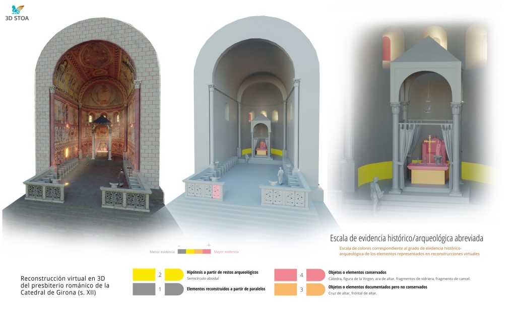 La arqueología virtual es una disciplina que nos aporta las herramientas adecuadas para recuperar de forma científica la imagen visual del pasado. De este modo, en ocasiones podemos encontrarnos con elementos fácilmente reconstruibles, para los que conservamos infinidad de evidencias, y otros de los que, sin embargo, únicamente restan pequeños indicios. En este último caso tenemos que servirnos de análisis comparativos y paralelos histórico-arqueológicos e histórico-artísticos para conseguir reconstruir la hipótesis visual de lo que una vez fue. Es el caso de esta reconstrucción virtual del presbiterio de la catedral románica de Girona (ss. XI-XII).