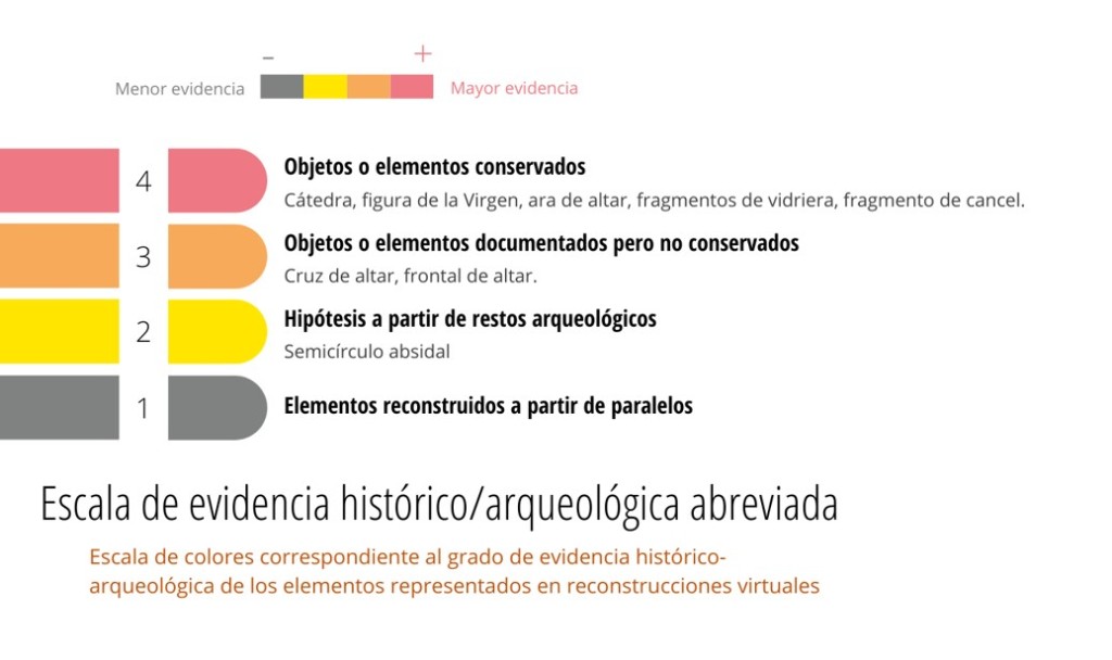 Para garantizar la transparencia de la reconstrucción virtual y permitir comprender el nivel de evidencia de cada uno de los elementos, hemos aplicado el uso de la escala de evidencia histórico-arqueológica, en este caso con una versión abreviada de la misma, que presentamos aquí por primera vez.