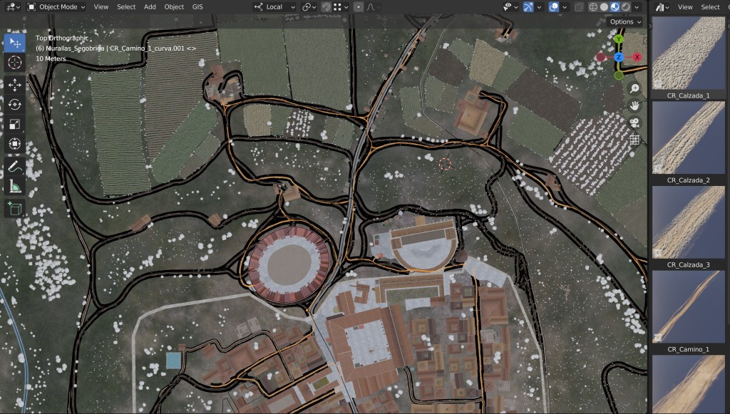 Posteriormente texturicé de forma básica el terreno, superponiendo mapas de texturas de tierra y hierba que aporten realismo y permitan integrar correctamente los modelos de los edificios en el paisaje. Como curiosidad, todas las vías y calzadas, así como las zonas de cultivo, están creadas también mediante un sistema de assets prediseñados que dispongo por el terreno y que se adaptan a él exactamente en los lugares en los que yo quiero que se dispongan. Por otro lado, todas las capas de vegetación (árboles de diferente tipo, arbustos, hierba) y otros elementos (rocas, personajes, nubes, etc.) han sido dispuestos sobre el terreno utilizando el addon GeoScatter de Blender. ¡Una herramienta fundamental!