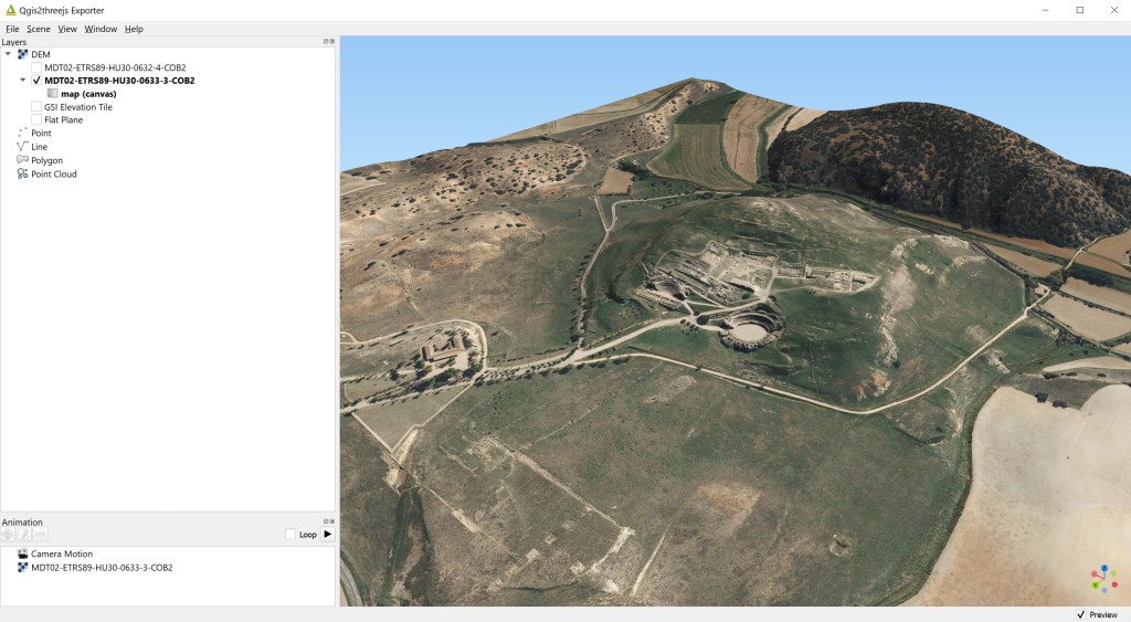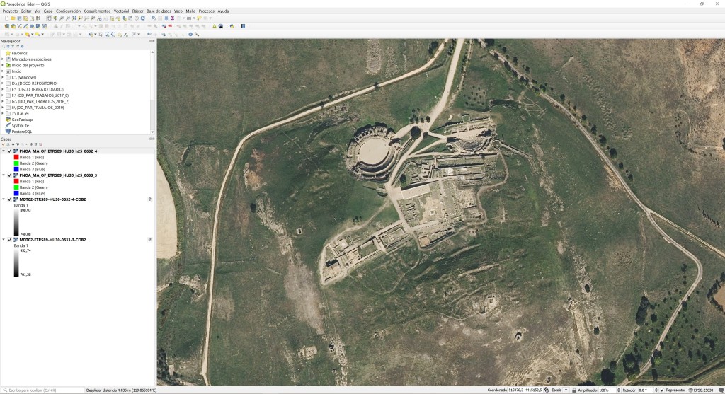 El primer paso fue llevar a cabo el proceso de documentación, para lo cual , además de recopilar, leer e interpretar toda la información posible, conté con la ayuda de Rosario Cebrián, directora científica del Parque Arqueológico de Segóbriga, a quien agradezco enormemente su colaboración. El siguiente paso fue obtener el modelo digital del terreno del yacimiento y su entorno (MDT) gracias al centro de descargas del IGN, trabajando modelos LIDAR y ortofotos en Qgis.