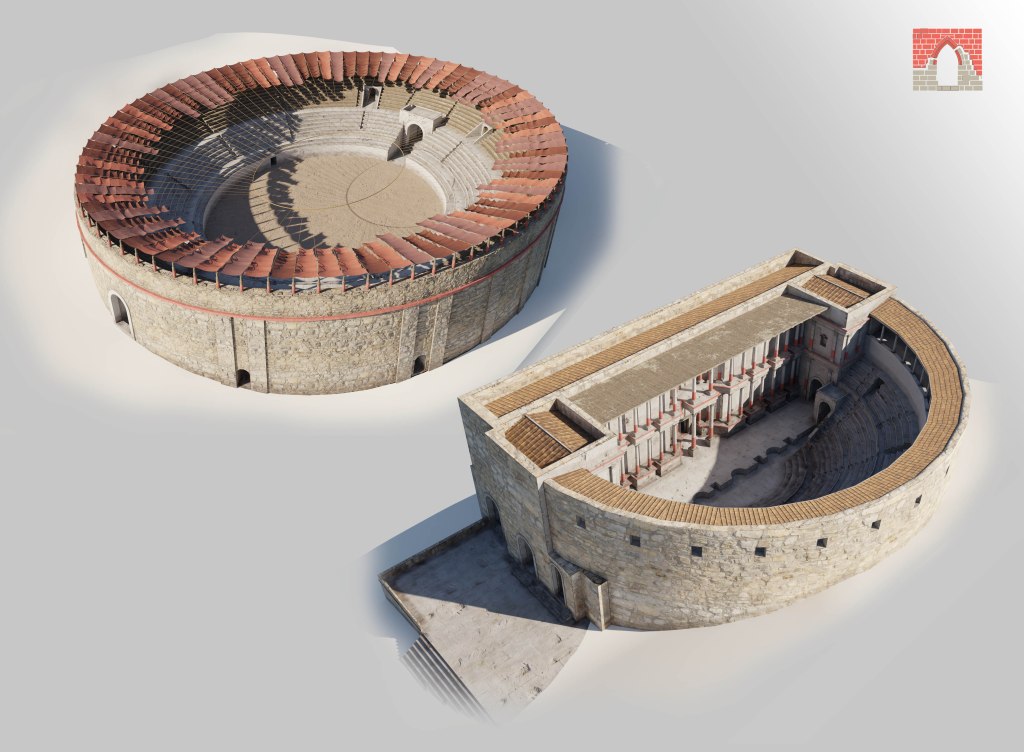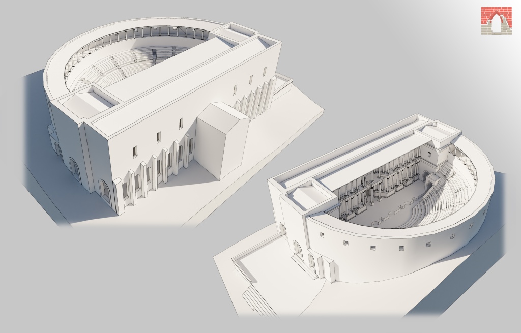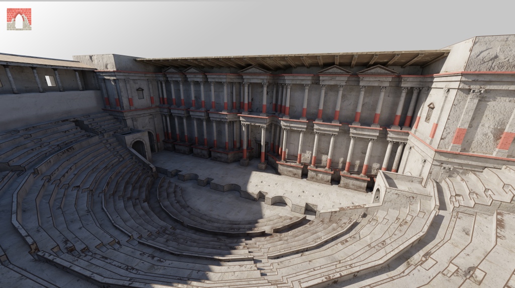 A partir de ahí, una vez determinada la hipótesis que llevaríamos a cabo, tocaba reconstruir los edificios más importantes de Segóbriga. Comencé por el teatro y, trabajando siempre en Blender, llevé a cabo una reconstrucción de bajos polígonos que pudiera integrarse fácilmente después en el conjunto de la ciudad. Pronto tuve el teatro y el anfiteatro reconstruidos, siempre basándome en las planimetrías e hipótesis arqueológicas, aunque sin entrar en excesivo detalle ya que el objetivo de la reconstrucción es, recordad, mucho más amplio.