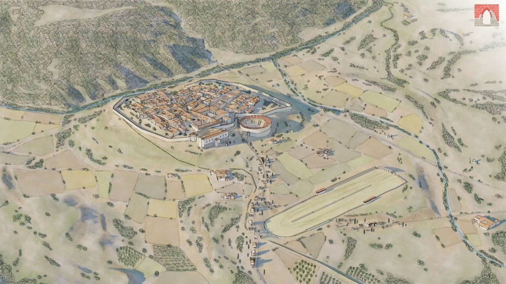 Si observamos toda la ciudad y su entorno a vista de pájaro, podemos descubrir la colina de la ciudad y, tras ella, al sur, el curso del río Gigüela. Al norte una gran explanada con zonas de cultivo y producción, así como un circo, solo parcialmente construido. Está documentado arqueológicamente que, para la construcción del circo, se sepultó parte de una necrópolis que discurría hacia el oeste, llevándose a cabo los ritos pertinentes para ello.