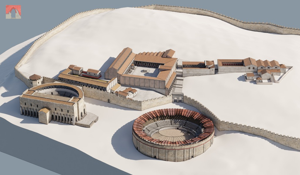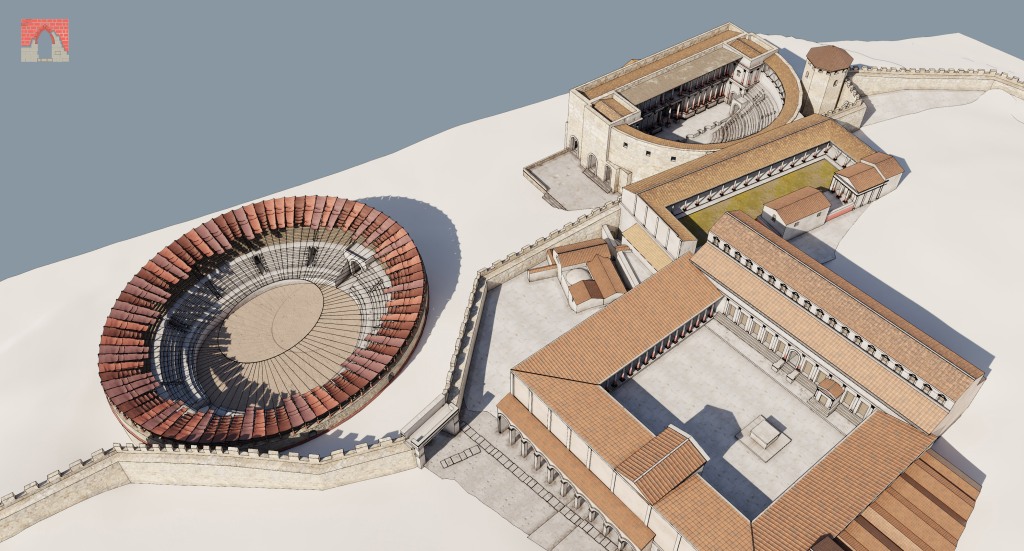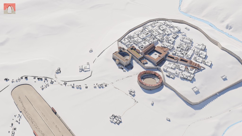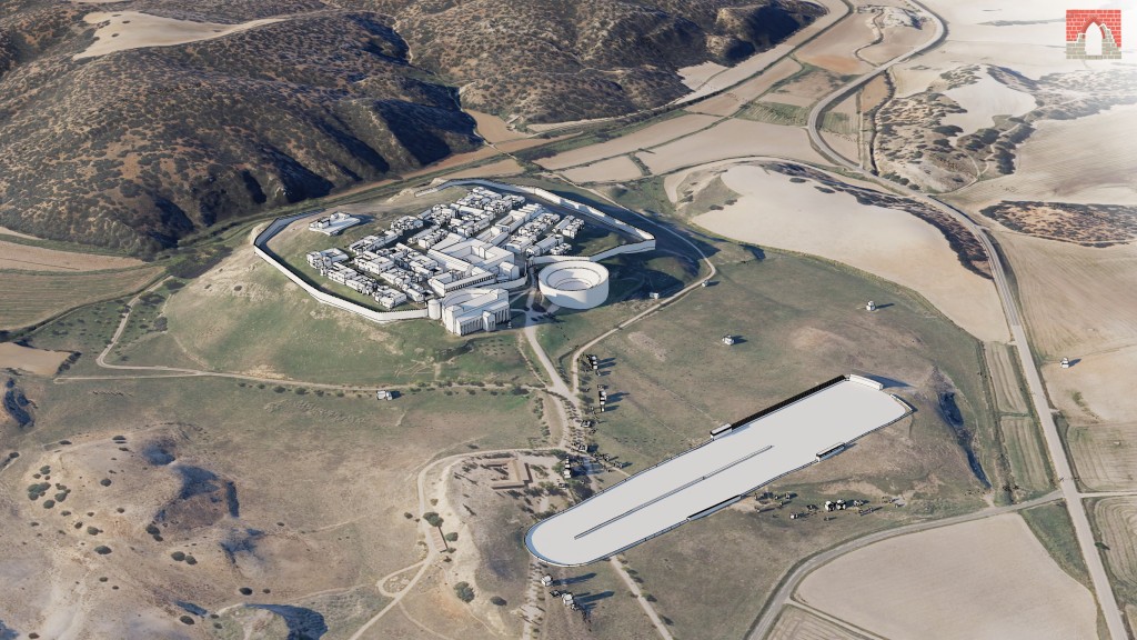 En esta infografía os indico los espacios y elementos más importantes documentados en la ciudad y que pueden apreciarse en la reconstrucción. A los que, por supuesto, habría que añadir el circo que ya hemos mencionado antes y que se aprecia bien desde el resto de vistas aéreas.