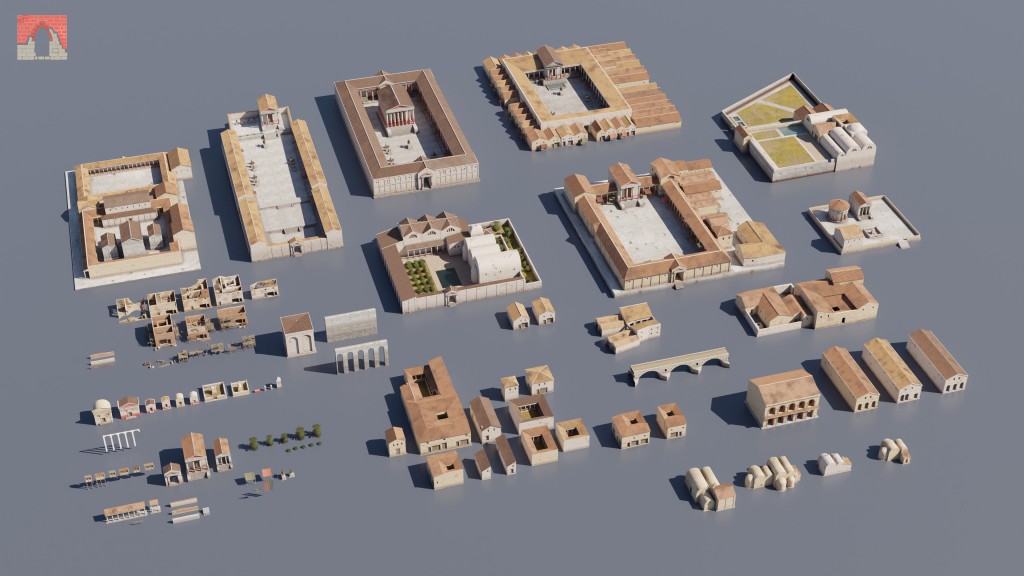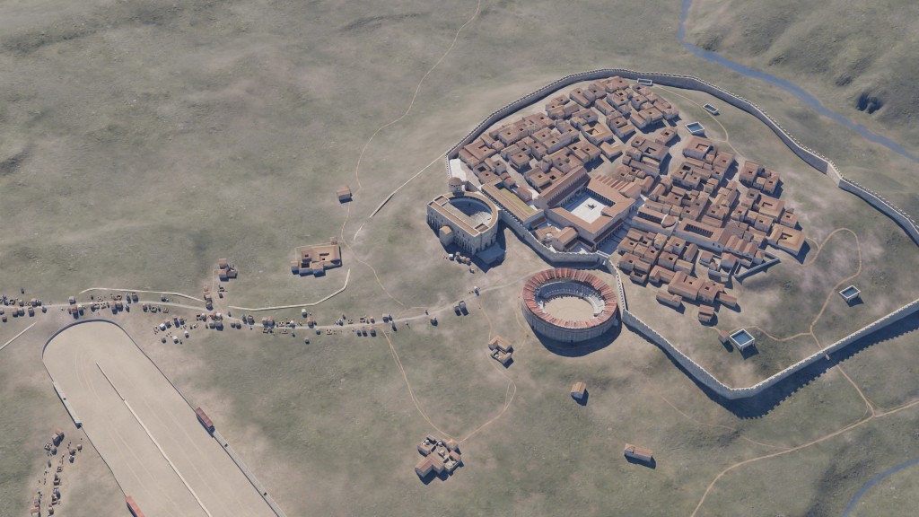 Poco a poco fui diseñando el resto de edificios más representativos, entre ellos el Foro y la plaza de época tiberiana, y disponiéndolos sobre el mapa de elevaciones para ir construyendo las relaciones espaciales entre ellos. Finalmente, añadí las murallas, el templo y las termas imperiales. Todo esto lo hice creando materiales y texturas ágiles en Blender, que pudieran ser reutilizados, de modo que el trabajo se mantenga siempre optimizado y nos asegure unos renderizados rápidos de cara al futuro.