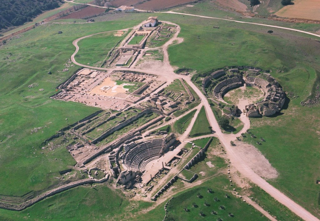 Precisamente, aquí tenéis una vista desde el oeste que nos permite ver todo el entorno dominado por la ciudad que, en su frente norte, quedaba engrandecida por el teatro y el anfiteatro, a izquierda y derecha, respectivamente, de su camino de entrada principal.