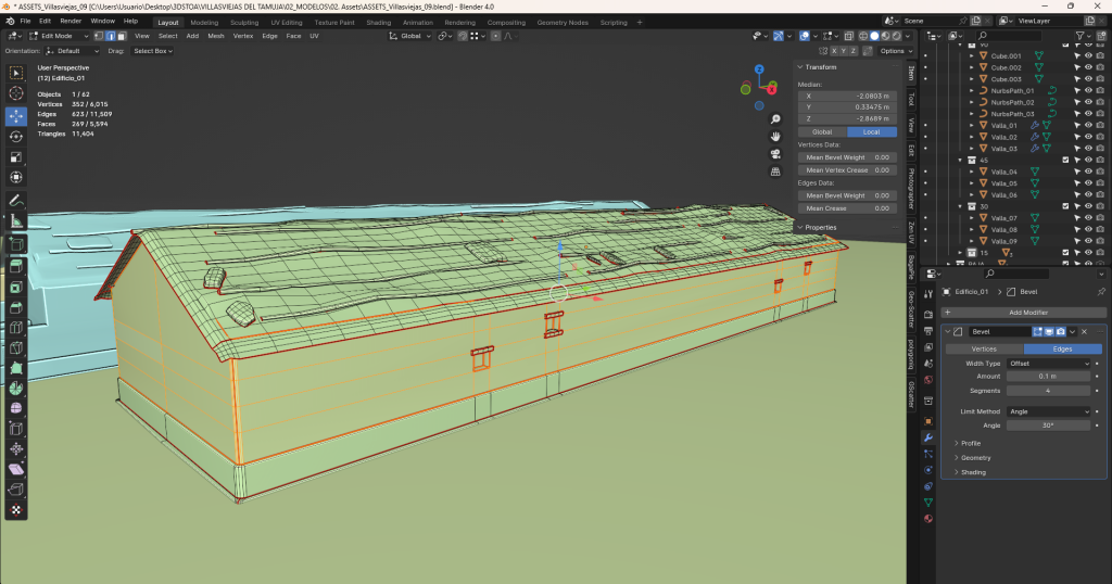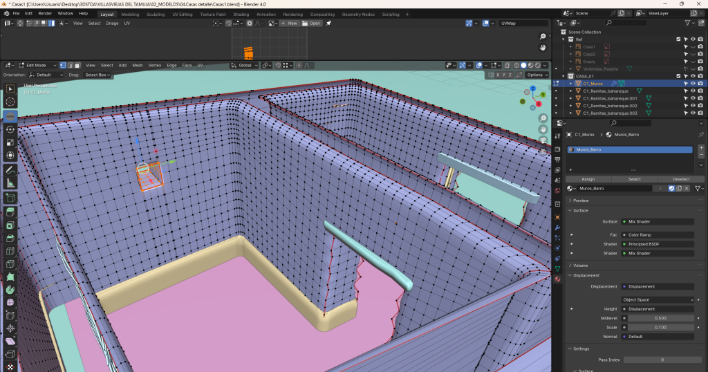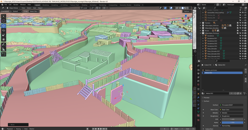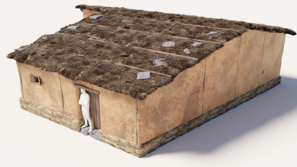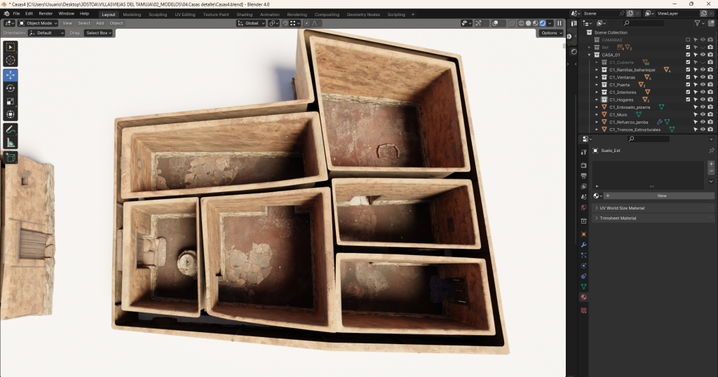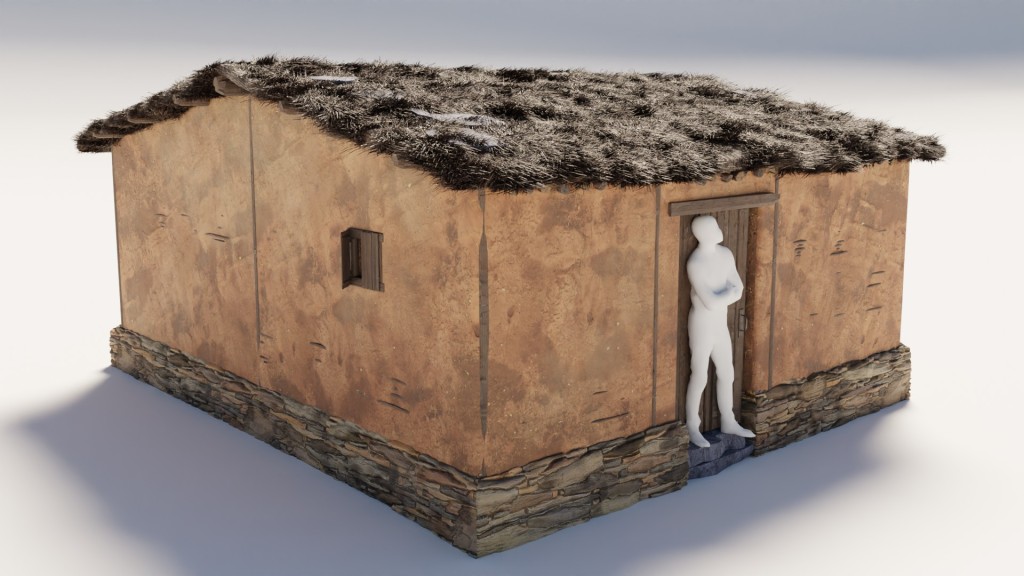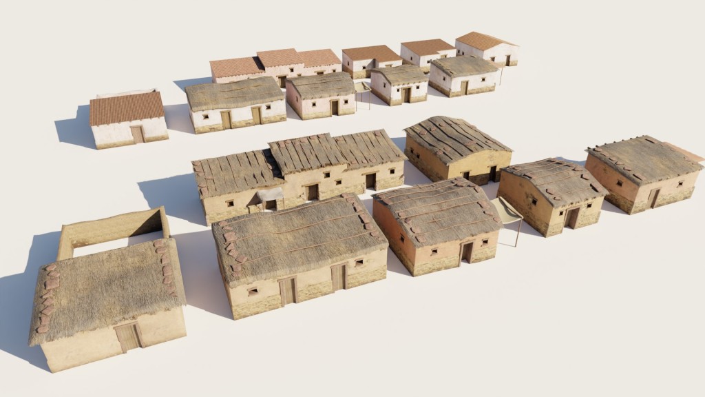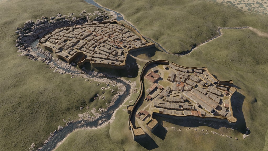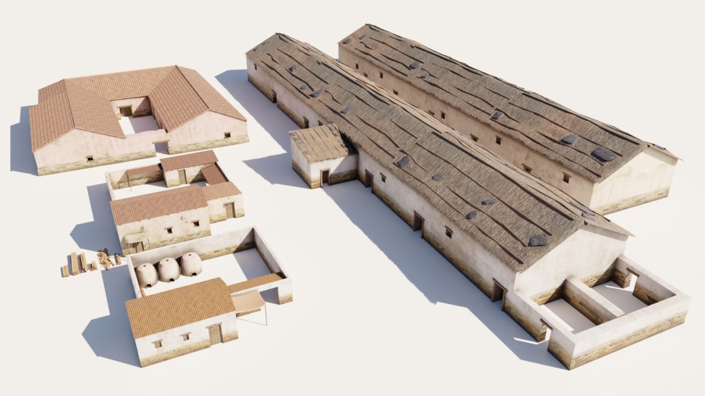 Después diseñamos en 3D de forma optimizada los edificios que completarían la reconstrucción, mezclando estructuras con cubiertas de teja romana con otras, más tradicionales de la zona, de cubierta vegetal, tal y como nos dice la arqueología que ocurría en Villasviejas. El siguiente paso fue disponer sobre el terreno las viviendas pero también las murallas y otros elementos clave de los poblados, siguiendo en todo caso los datos arqueológicos disponibles. Esto nos permitió tener ya una primera impresión de los dos recintos diferenciados: el «pueblo viejo», en el recodo del río más protegido y escarpado, y el nuevo recinto relacionado probablemente con el asentamiento militar romano.