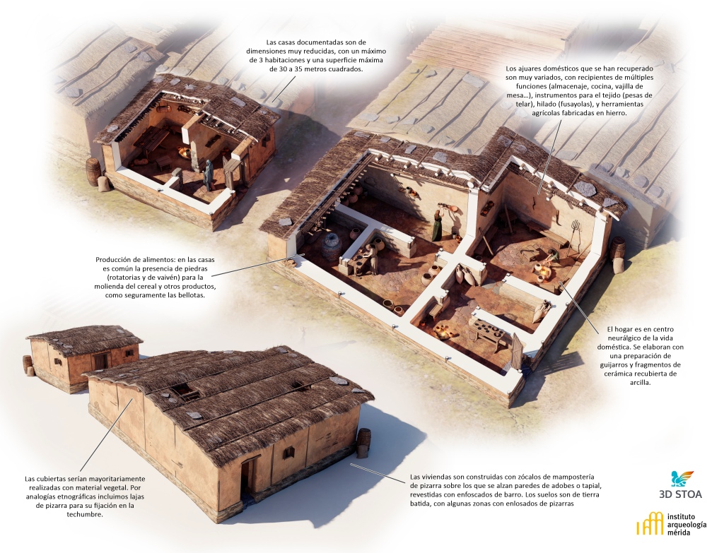 Pero, ¿Cómo fueron sus viviendas si las observamos en detalle? Para entenderlo mejor hemos reconstruido la manzana de casas excavada por F. Hernández. Se trata de casas de dimensiones reducidas, con estancias generalmente dispuestas en torno a un hogar, levantadas sobre un zócalo de pizarra y con muros de adobe o tapial revestidos con enfoscados de barro.
