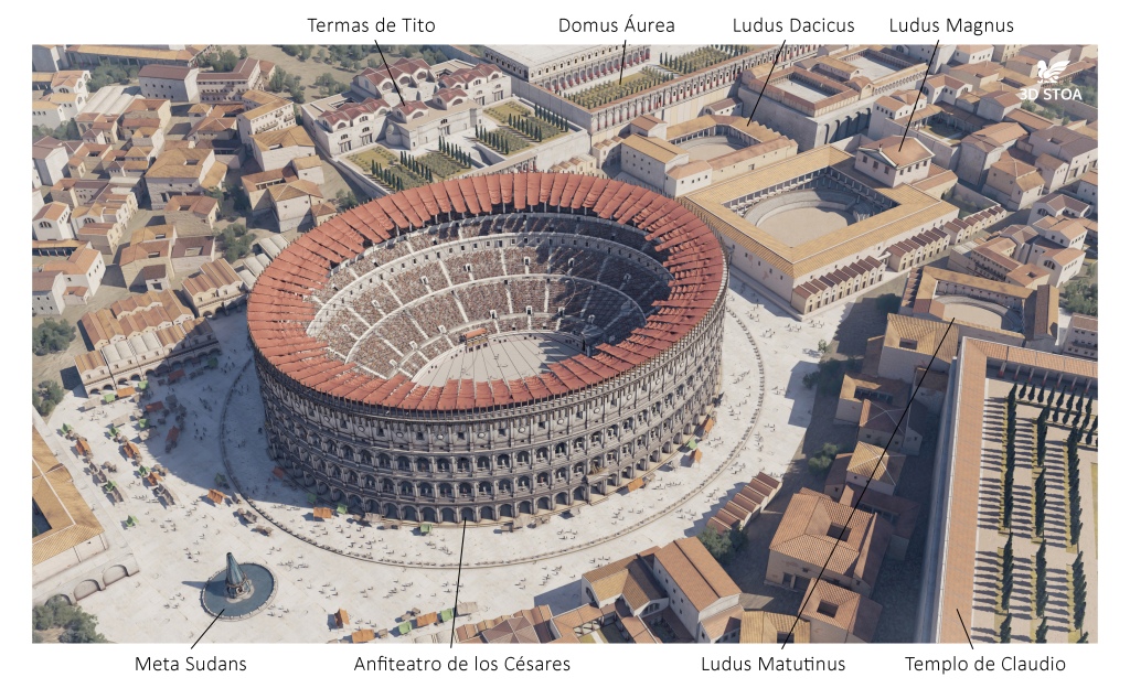 Para ello, viajamos siglos antes al año 96, en tiempos de Domiciano, y recreamos esta vista aérea del área del Coliseo en un día de juegos.